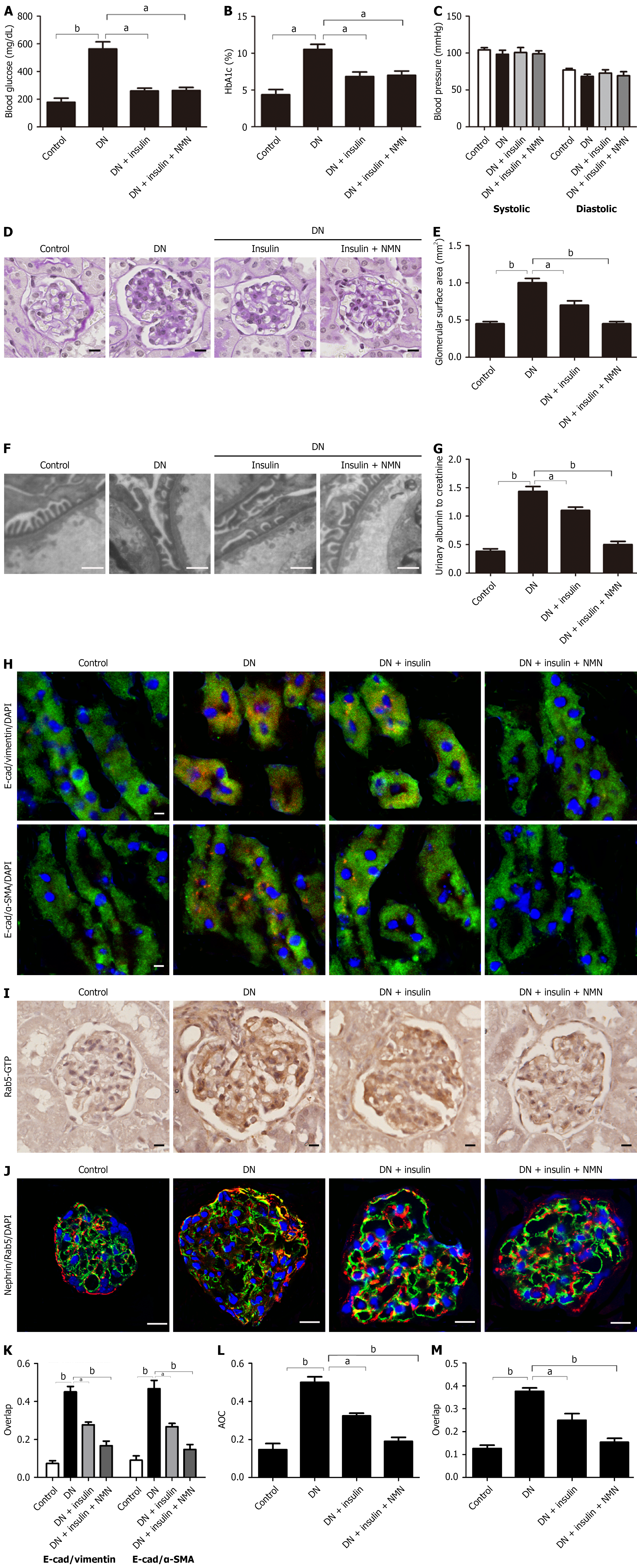 A and B: Blood glucose and HbA1c levels in the different groups; C: Systolic and diastolic blood pressure in the different groups; D and E: Representative PAS staining (magnification × 400; scale bar: 50 μm) and quantification of the glomerular surface area in different groups (n = 10 glomeruli/group); F: Representative electron microscopy images of podocyte foot process effacement in the different groups (magnification × 10,000; scale bar: 100 μm); G: Urinary albumin excretion (albumin/creatinine ratio) in the different groups (n = 5); H and I: Co-localization images and quantification of the epithelial-to-mesenchymal transition, indicated by altered E-cadherin and α-SMA expression, in the different groups (magnification × 630; scale bar: 20 μm); J and K: Immunohistochemical staining and quantification of glomerular expression of Rab5-GTP in the different groups (magnification × 400; scale bar: 20 μm); L and M: Immunofluorescence co-localization and quantification of nephrin and active Rab5 (Rab5-GTP) in the different groups (magnification × 630; scale bar: 20 μm). Data are expressed as mean ± SEM. aP < 0.05; bP < 0.001. DN: Diabetic nephropathy; NMN: Nicotinamide mononucleotide; AOC: Area of coverage.