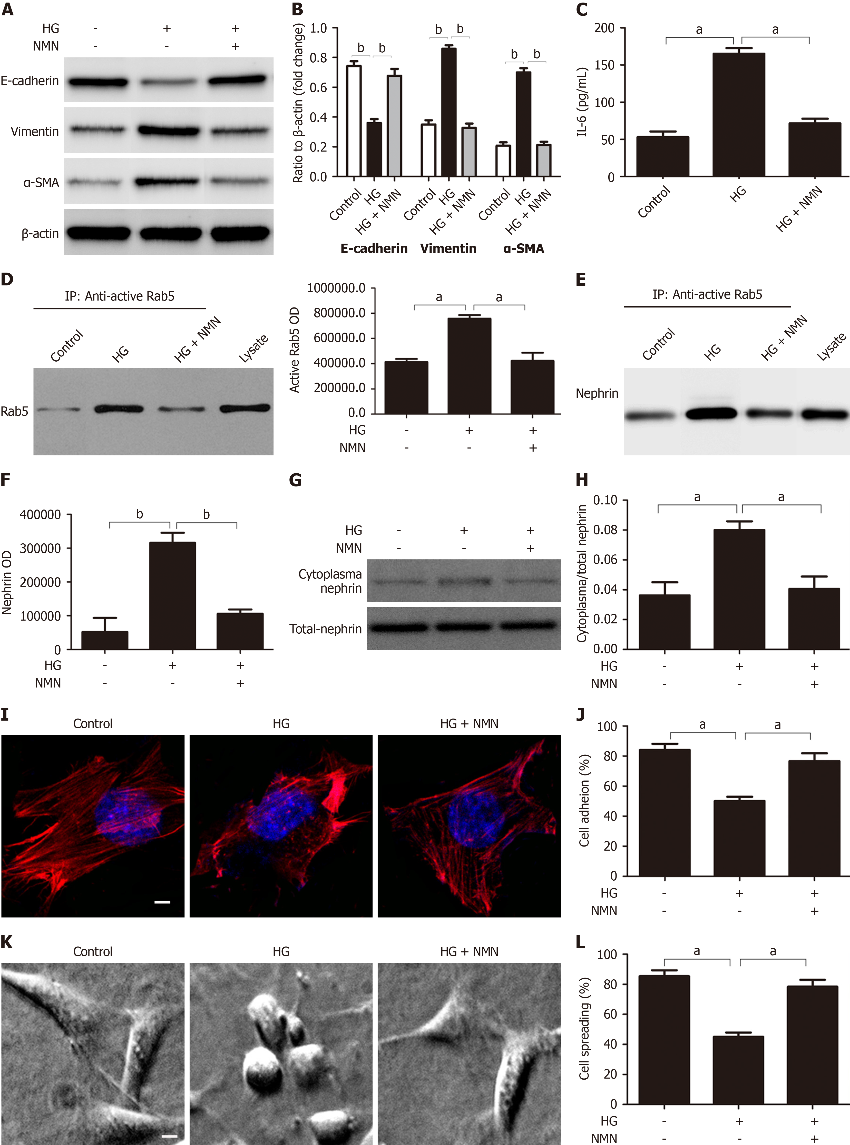 A and B: Western blot analysis of epithelial-to-mesenchymal transition markers in HK-2 cells that received different treatments and quantification of these results (n = 3); C: IL-6 secretion by HK-2 cells that received different treatments (n = 3); D: Co-immunoprecipitation of active Rab5 in podocytes cultured in different conditioned media and quantification of these results; E and F: Co-immunoprecipitation of nephrin and active Rab5 in podocytes cultured in different conditioned media and quantification of the results (n = 3); G and H: Western blot analysis of cytoplasmic nephrin (C-nephrin) and total nephrin (T-nephrin) from podocytes cultured in different conditioned media and quantification of C-nephrin/T-nephrin ratio (n = 3); I: Representative confocal microscopy images of podocytes cultured in different conditioned media (magnification: × 1000; scale bar: 50 μm; red: Cytoskeleton; blue: Nuclei); J: Quantification of podocyte adhesion after culture in different conditioned media (n = 3); K: Representative electron microscopy images of podocyte spreading after culture in different conditioned media (magnification: × 400; scale bar: 20 μm); L: Quantitative analysis of podocyte spreading after culture in different conditioned media (n = 3). aP < 0.05; bP < 0.001. HG: High-dose glucose; NMN: Nicotinamide mononucleotide.
