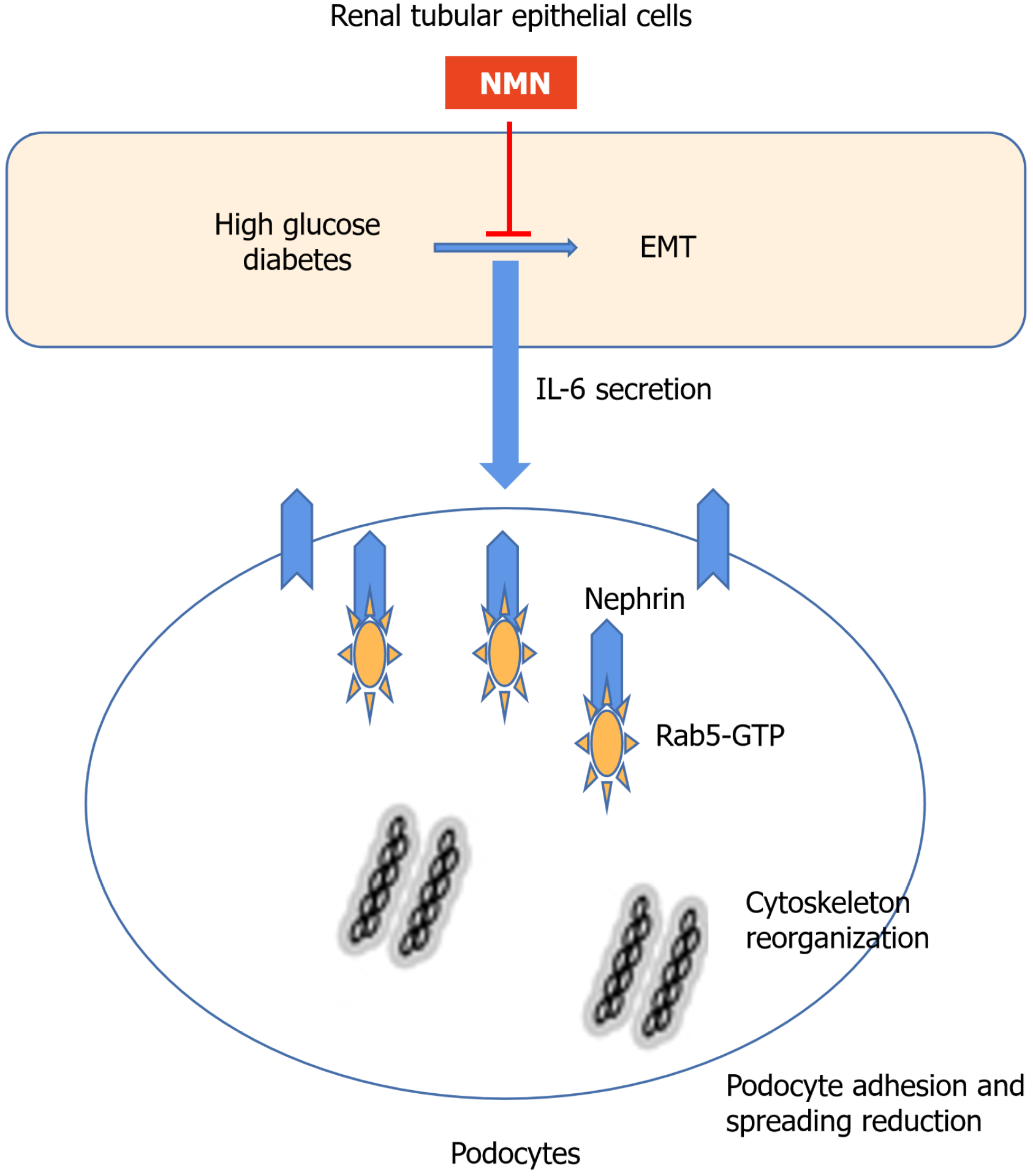 High-dose glucose induces the epithelial-mesenchymal transition and secretion of IL-6 by proximal tubular epithelial cells (PTECs). Podocytes sense this IL-6, and this leads to the binding of internalized nephrin with active Rab5, followed by disruptions of the cytoskeleton, podocyte adhesion, and podocyte spreading. nicotinamide mononucleotide blocks signaling from the PTECs, decreases the binding of nephrin with active Rab5, and ameliorates cellular damage. EMT: Epithelial-mesenchymal transition; NMN: Nicotinamide mononucleotide.
