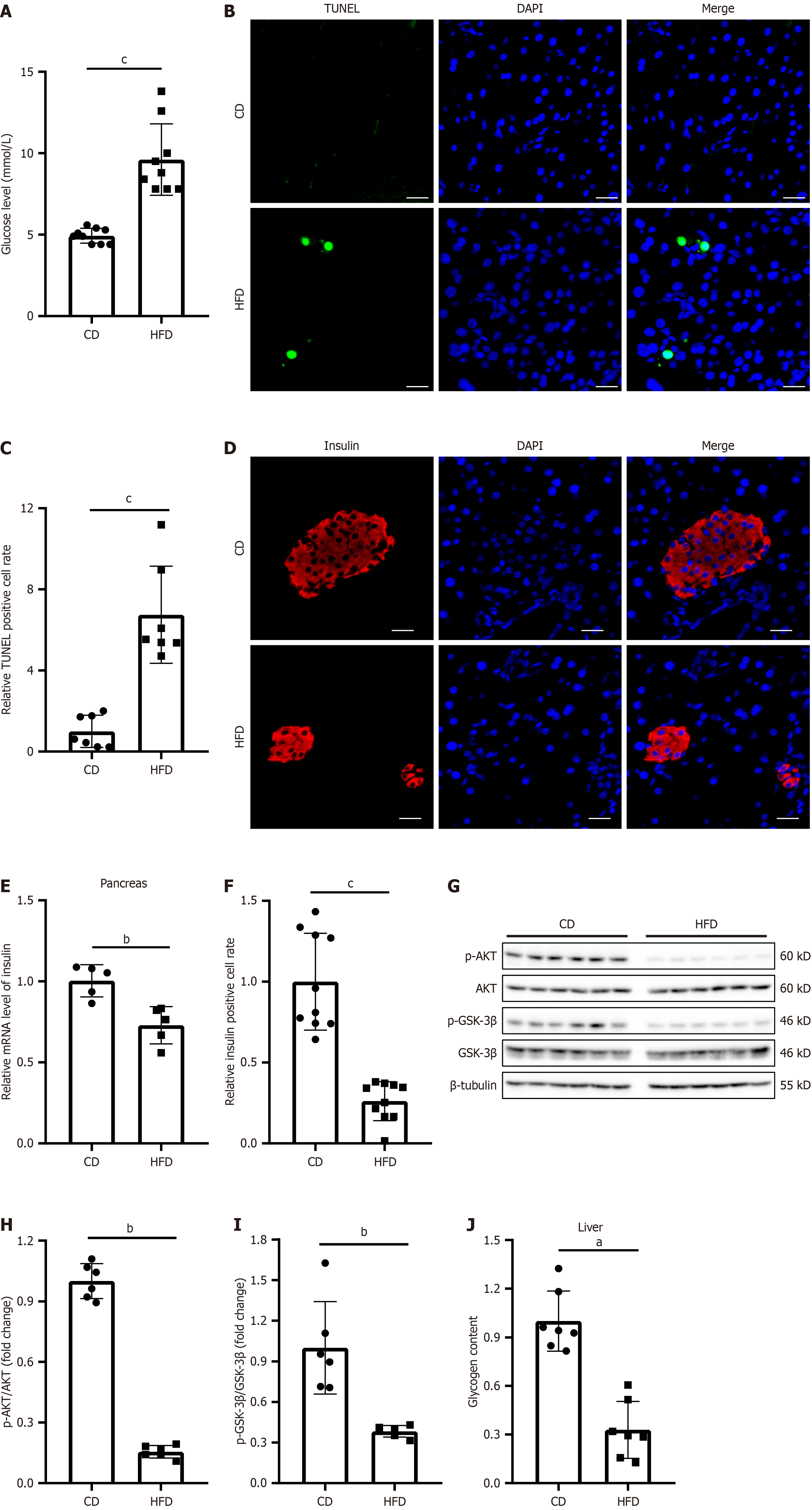 The mice were fed a chow diet or high-fat diet for 18 weeks. A: Fasting blood glucose levels; B: TUNEL staining for apoptotic cells in the pancreas; C: Quantification of TUNEL-positive cells via ImageJ software; D: Immunofluorescence staining for insulin in the pancreas; E: Insulin mRNA levels in the pancreas; F: Quantification of insulin-positive areas using ImageJ software; G: Western blot analysis of AKT/GSK signaling in the liver; H and I: Densitometric quantification of relative protein levels normalized to β-actin performed using ImageJ; J: Liver glycogen content. The experiments were repeated three times. aP < 0.05, bP < 0.01, cP < 0.001. Scale bar: 20 μm. Western blot raw data in Supplementary material.