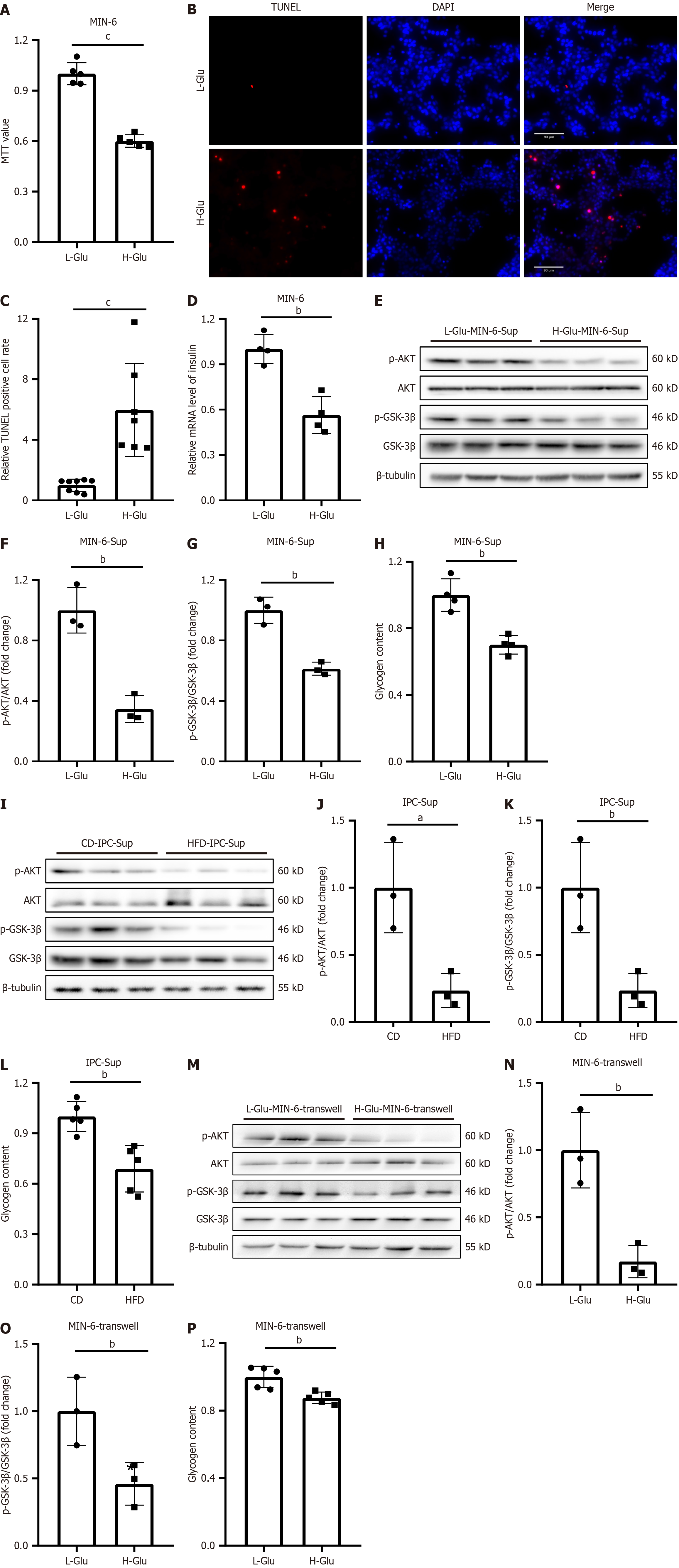 MIN-6 cells were treated with low (5.5 mmol/L) or high (33.5 mmol/L) glucose. A: Cell viability was detected by MTT assay; B and C: TUNEL staining and quantification of apoptotic MIN-6 cells; D: Insulin mRNA expression levels in MIN-6 cells. Hep1-6 cells were treated with supernatant from MIN-6 cells (MIN6-Sup); E-G: Western blot analysis of AKT and GSK-3β phosphorylation levels; H: Detection of the glycogen content. Hep1-6 cells were treated with conditioned media from primary islet cells (IPC-Sup) of high-fat diet-fed or chow diet-fed mice; I-K: Western blot analysis of AKT and GSK-3β phosphorylation levels; L: Detection of the glycogen content. MIN-6 and Hep1-6 cells were cocultured using Transwell plates; M-O: Western blot analysis of AKT and GSK-3β phosphorylation levels; P: Detection of the glycogen content. The experiments were repeated three times. aP < 0.05, bP < 0.01, cP < 0.001. Western blot raw data in Supplementary material.