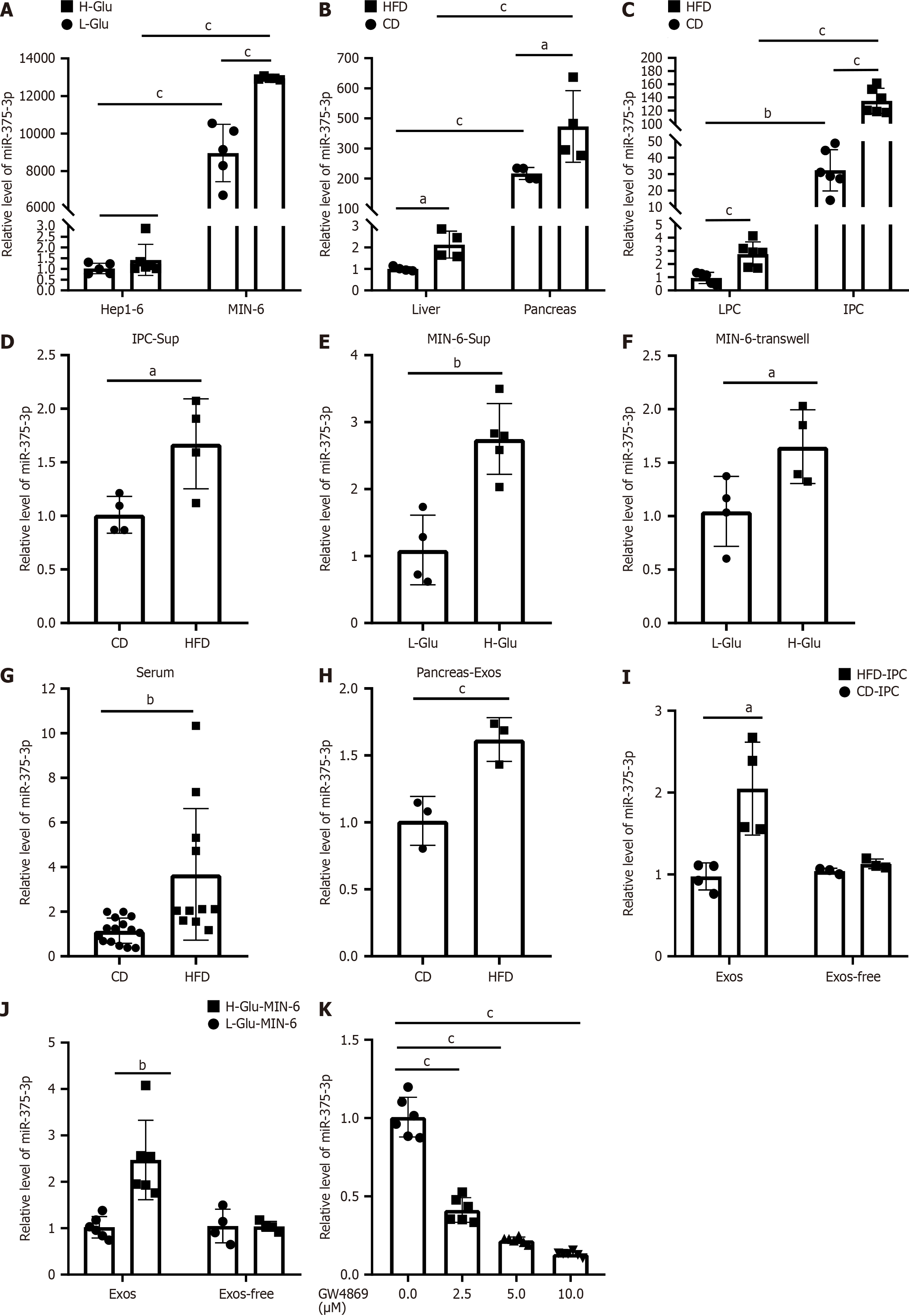Relative miR-375-3p levels were quantified by quantitative reverse transcription polymerase chain reaction. A: Hep1-6 and MIN-6 cells after low- or high-glucose stimulation; B: Pancreatic and liver tissues of high-fat diet (HFD)-fed or chow diet (CD)-fed mice; C: Primary islet cells (IPCs) and LPCs from HFD-fed or CD-fed mice; D: Hep1-6 cells treated with conditioned media from IPCs (IPC-Sup); E: Hep1-6 cells treated with conditioned media from MIN-6 cells (MIN6-Sup); F: Hep1-6 cells cocultured with MIN-6 cells using Transwell plates (MIN6-Transwell); G: Plasma of HFD-fed or CD-fed mice; H-J: Exosomes or exosome-depleted supernatantsisolated from pancreatic tissues (pancreas-Exos), IPCs (IPC-Exos), and MIN-6 cells (MIN-6 Exos); K: Hep1-6 cells treatment with conditioned media from GW4869-treated MIN-6 cells. The experiments were repeated three times. aP < 0.05, bP < 0.01, cP < 0.001.