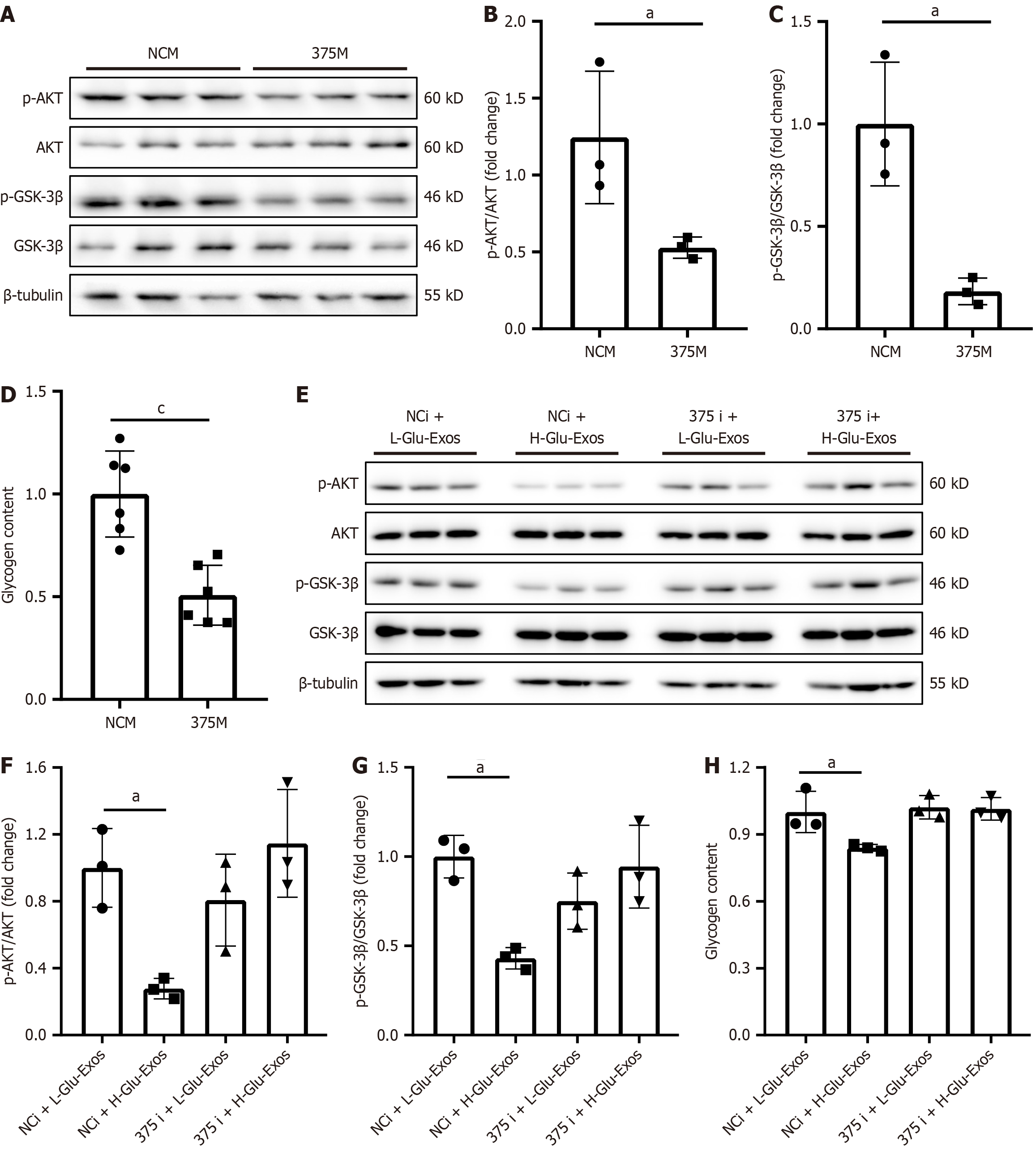 Hep1-6 cells were transfected with miR-375-3p mimics or control mimics for 48 hours using RNAi Max. A-C: Western blot analysis of AKT/GSK signaling and quantification of phosphorylated proteins; D: Glycogen content analysis in Hep1-6 cells. Hep1-6 cells were transfected with a miR-375-3p inhibitor or control inhibitor for 48 hours and treated with exosomes from low- or high-glucose-stimulated MIN-6 cells for 24 hours; E and F: Western blot analysis of AKT/GSK signaling and Rbpj protein levels; G: Densitometric quantification of the relative protein levels normalized to β-actin performed using ImageJ; H: Glycogen content analysis in Hep1-6 cells. The experiments were repeated three times. aP < 0.05, cP < 0.001. Western blot raw data in Supplementary material.