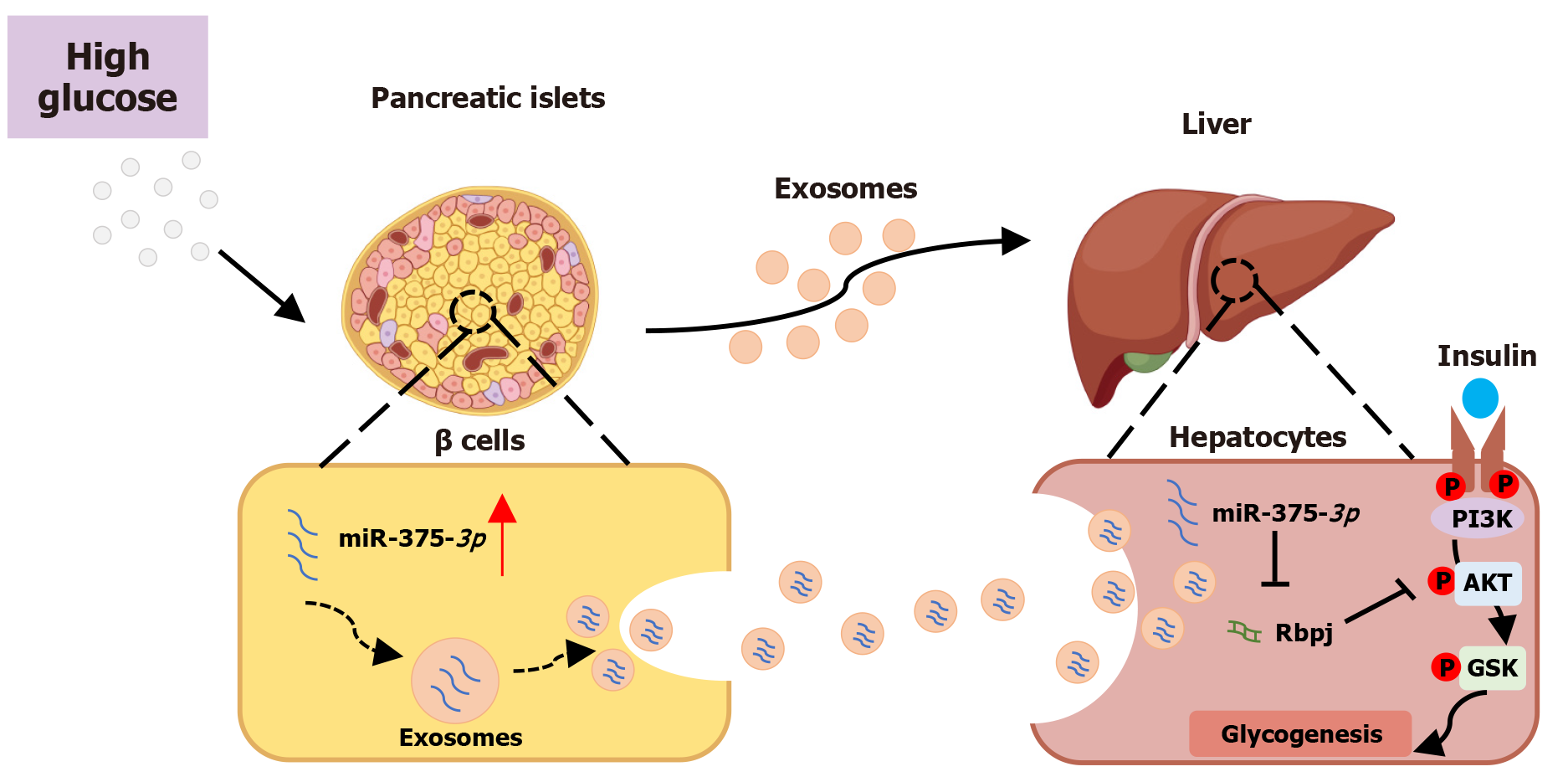 - Citation: Xu FZ, Dou L, Wu X, Xia CX, Yu DN, Man Y, Shen T, Huang XQ. Exosomal transfer of miR-375-3p from pancreatic β cells to hepatocytes impairs hepatic glycogenesis via Rbpj repression. World J Diabetes 2025; 16(10): 109815