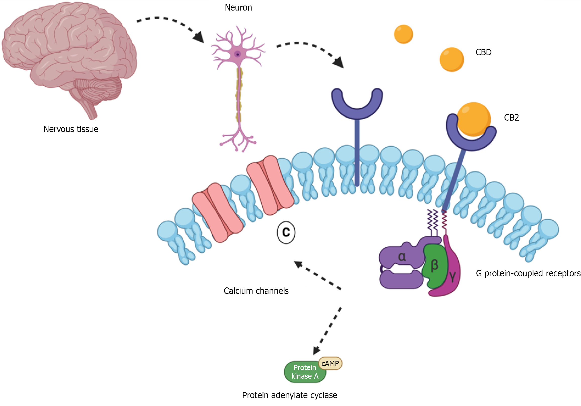 This figure illustrates how cannabidiol (CBD) interacts with cannabinoid type 1 receptor (CB1) located on neuronal membranes in the nervous system – an interaction relevant to its neuroprotective potential in type 1 diabetes. When CBD binds to the cannabinoid type 1 receptor, it activates associated G proteins that inhibit calcium ion channels, and the enzyme adenylate cyclase. As a result, cyclic adenosine monophosphate (cAMP) levels and protein kinase A activity are reduced, ultimately suppressing neurotransmitter release. Beyond this, CBD may also modulate key inflammatory mediators such as nuclear factor kappa B, interleukin 6, and tumor necrosis factor alpha, all of which are linked to neuroinflammation in type 1 diabetes. These combined effects suggest that CBD may help reduce oxidative stress and protect neuronal integrity.