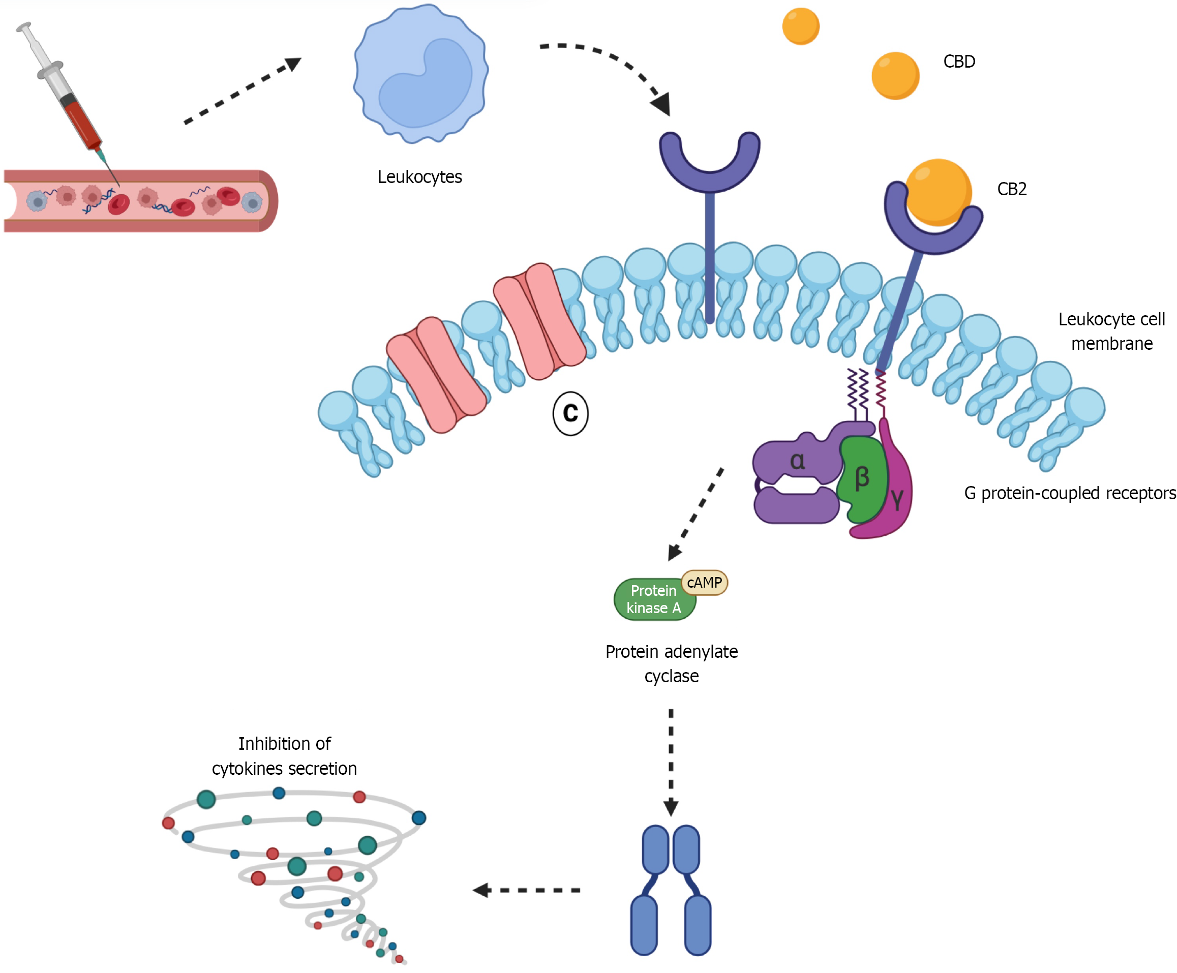 Figure 2 Cannabidiol activity on the cannabinoid receptor type 2 in leukocytes this figure illustrates the mechanism by which cannabidiol interacts with cannabinoid receptor type 2 Located on leukocyte membranes, emphasizing its role in modulating inflammation in type 1 diabetes mellitus.