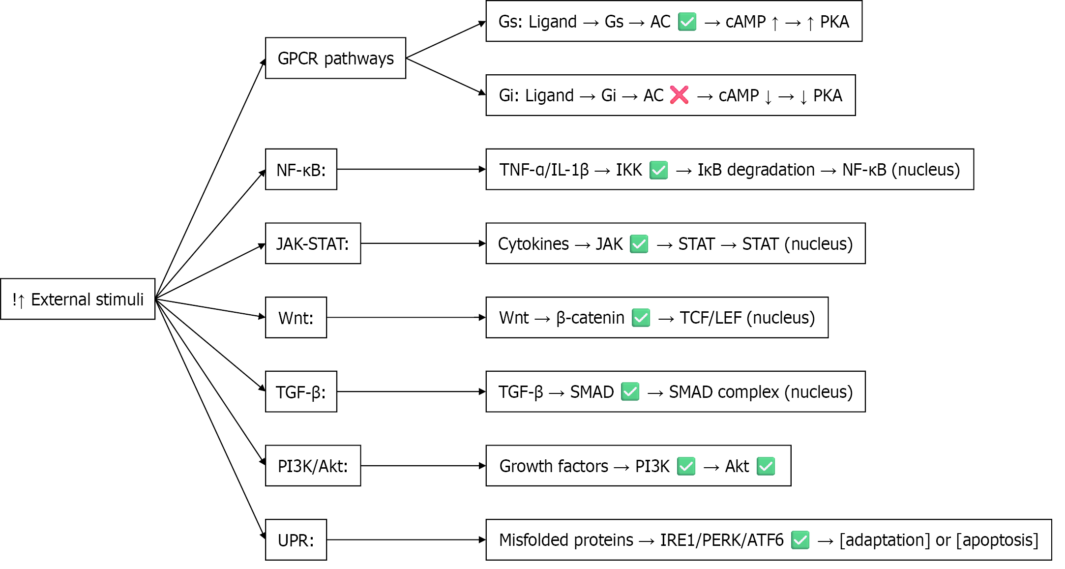 Each pathway involves specific signaling molecules and culminates in transcriptional regulation, cellular adaptation, or apoptosis. Akt: Protein kinase B; ATF6: Activating transcription factor 6; cAMP: Cyclic adenosine monophosphate; Gi: Inhibitory G proteins; GPCR: G protein-coupled receptor; Gs: Stimulatory G proteins; IκB: Inhibitor of nuclear factor kappa B; IL: Interleukin; IRE1: Inositol-requiring enzyme 1; JAK: Janus kinase; LEF: Lymphoid enhancer-binding factor; NF-κB: Nuclear factor kappa B; PERK: Protein kinase RNA-like endoplasmic reticulum kinase; PI3K: Phosphoinositide 3-kinase; PKA: Protein kinase A; SMAD: Small mothers against decapentaplegic homolog; STAT: Signal transducer and activator of transcription; TCF: T-cell factor; TGF-β: Transforming growth factor beta; TNF: Tumor necrosis factor; Wnt: Wingless/integrated; UPR: Unfolded protein response.