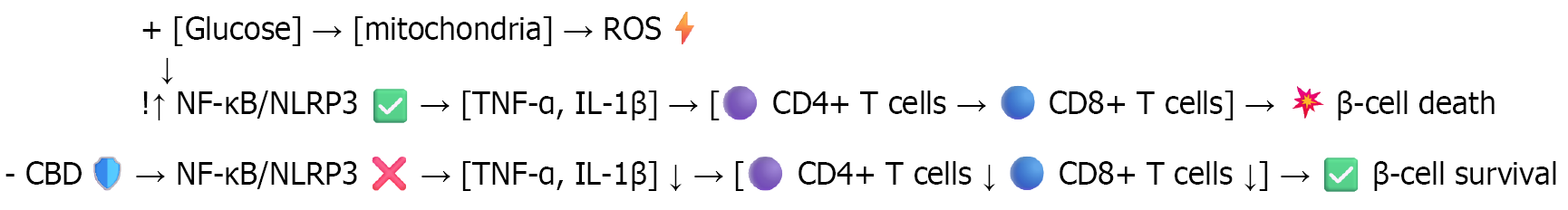 This activation raises pro-inflammatory cytokines [tumor necrosis factor alpha (TNF-α) and interleukin 1 beta (IL-1β)], promoting CD4+ and CD8+ T-cell activation and resulting in β-cell death. Cannabidiol (CBD) inhibits nuclear factor kappa B (NF-κB)/nucleotide-binding oligomerization domain, leucine-rich repeat and pyrin domain-containing protein 3 (NLRP3) activation, thereby reducing TNF-α and IL-1β levels. This downregulates CD4+ and CD8+ T-cell activity, contributing to β-cell survival.