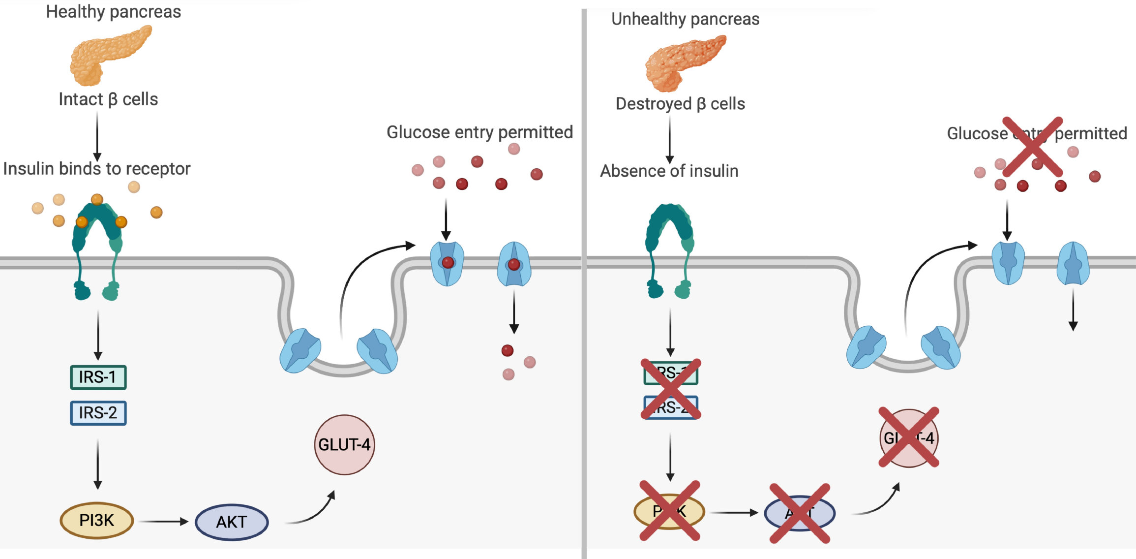 This figure illustrates the effects of healthy vs impaired pancreatic function on glucose metabolism in type 1 diabetes. In the healthy pancreas (panel A, left), functional β cells secrete insulin, which binds to its receptor on the cell membrane and activates a signaling cascade via insulin receptor substrate 1 (IRS-1) and IRS-2. This triggers the phosphoinositide 3-kinase (PI3K)/protein kinase B (PKB) pathway, promoting the translocation of glucose transporter type 4 (GLUT4) to the membrane and facilitating glucose entry into muscle cells. By contrast, panel B (right) depicts the absence of insulin secretion due to β-cell destruction, which disrupts activation of the IRS-1/IRS-2 and PI3K/PKB pathways. As a result, GLUT4 translocation is impaired, preventing glucose uptake and leading to hyperglycemia. This dysfunction is closely associated with inflammatory and oxidative stress in type 1 diabetes, reinforcing the importance of therapeutic strategies that preserve β-cell function or modulate inflammation.