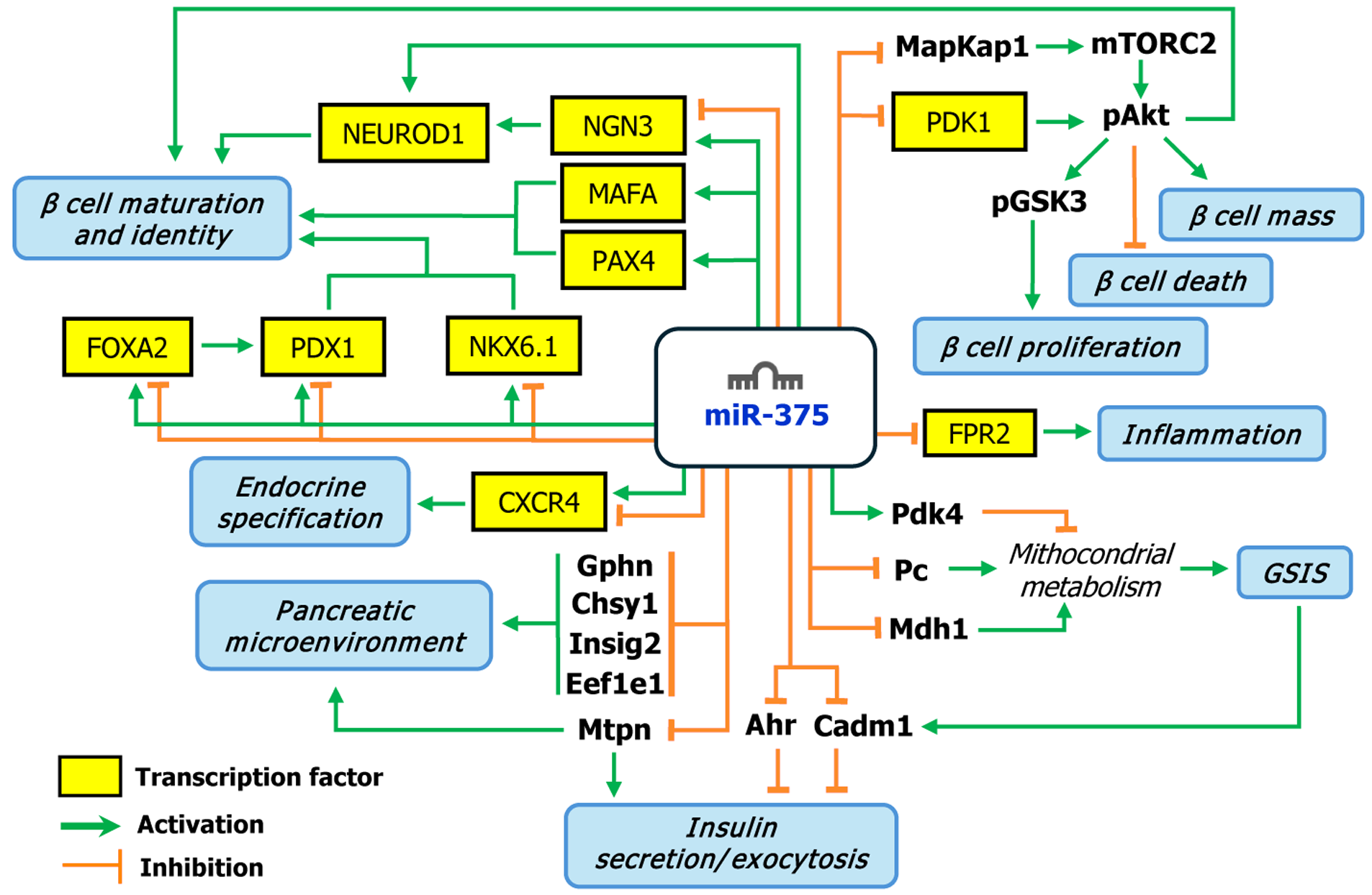 Green arrows indicate positive regulation (activation), while orange lines ending with a T bar represent negative regulation (inhibition). NEURPD1: Neurogenic differentiation 1; NGN3: Neurogenin 3; MAFA: V-maf avian musculoaponeurotic fibrosarcoma oncogene homolog A; PAX4: Paired box 4; FOXA2: Forkhead box A2; PDX1: Pancreatic and duodenal homeobox-1; NKX6.1: NK6 homeobox 1; CXCR4: C-X-C chemokine receptor type 4; Gphn: Gephyrin; Chsy1: Chondroitin sulfate synthase 1; Insig2: Insulin induced gene 2; Eef1e1: Eukaryotic translation elongation factor 1 epsilon 1; Mtpn: Myotrophin; miR-375: MicroRNA 375; MAPKAP1: Mitogen-activated protein kinase associated protein 1; mTORC2: Mammalian target of rapamycin complex 2; PDK1: 3-phosphoinositide-dependent protein kinase 1; pAkt: Phosphorylated protein kinase B; pGSK3: Phosphorylated glycogen synthase kinase 3; FPR2: Formyl peptide receptor 2; Pdk4: Pyruvate dehydrogenase kinase 4; Pc: Pyruvate carboxylase; Mdh1: Malate dehydrogenase 1; GSIS: Glucose - stimulated insulin secretion; Ahr: Aryl hydrocarbon receptor; Cadm1: Cell adhesion molecule 1.
