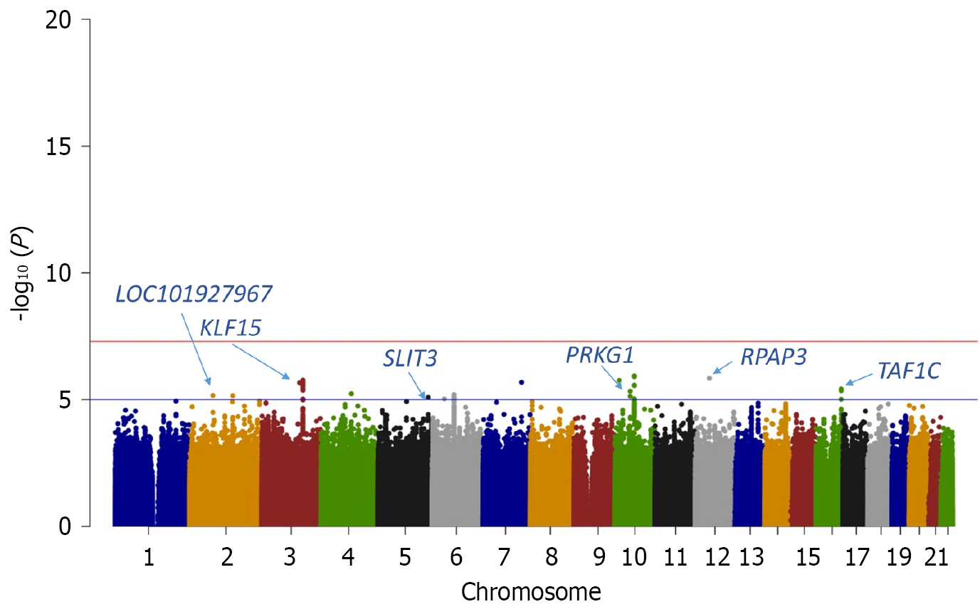 The bottom blue line indicates the genome-wide suggestive significance threshold of P < 1 × 10-5. KLF15: Kruppel-like factor 15; SLIT3: Slit guidance ligand 3; PRKG1: CGMP-dependent protein kinase 1; RPAP3: RNA polymerase II-associated protein 3; TAF1C: TATA-box binding protein associated factor, RNA polymerase I subunit C.