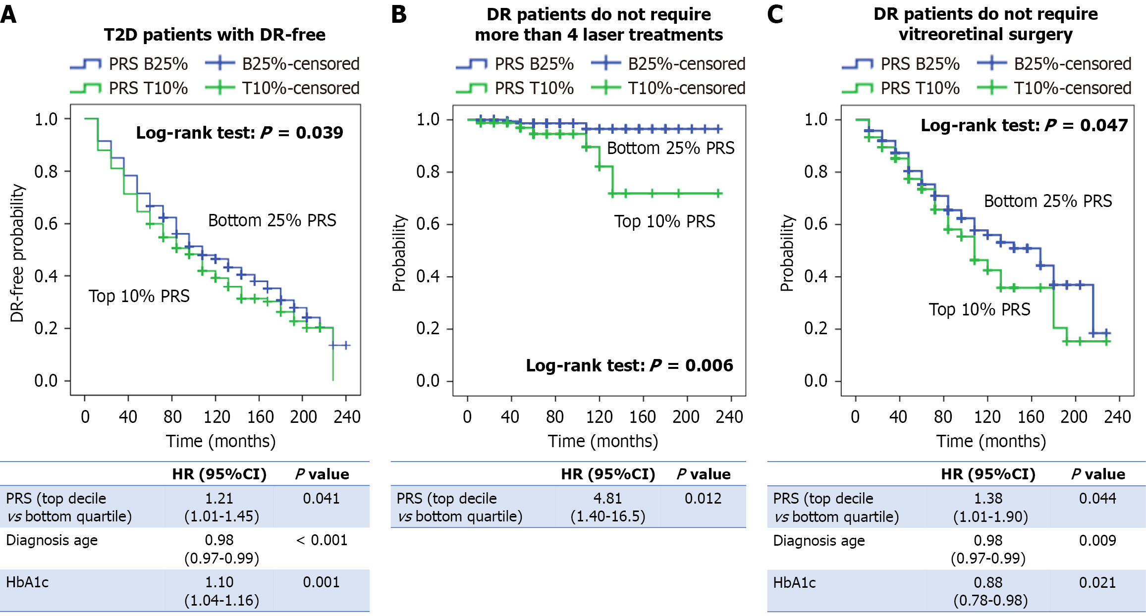 A: Patients with type 2 diabetes remaining diabetic retinopathy (DR)-free; B: Patients with DR not requiring more than four laser treatments; C: Patients with DR not requiring vitreoretinal surgery. Hazard ratios for patients in the top 10% of polygenic risk score were estimated using a Cox regression model adjusted for diagnosis age and glycated hemoglobin A1c. T2D: Type 2 diabetes; DR: Diabetic retinopathy; PRS: Polygenic risk score; HR: Hazard ratio; CI: Confidence interval; HbA1c: Glycated hemoglobin A1c.