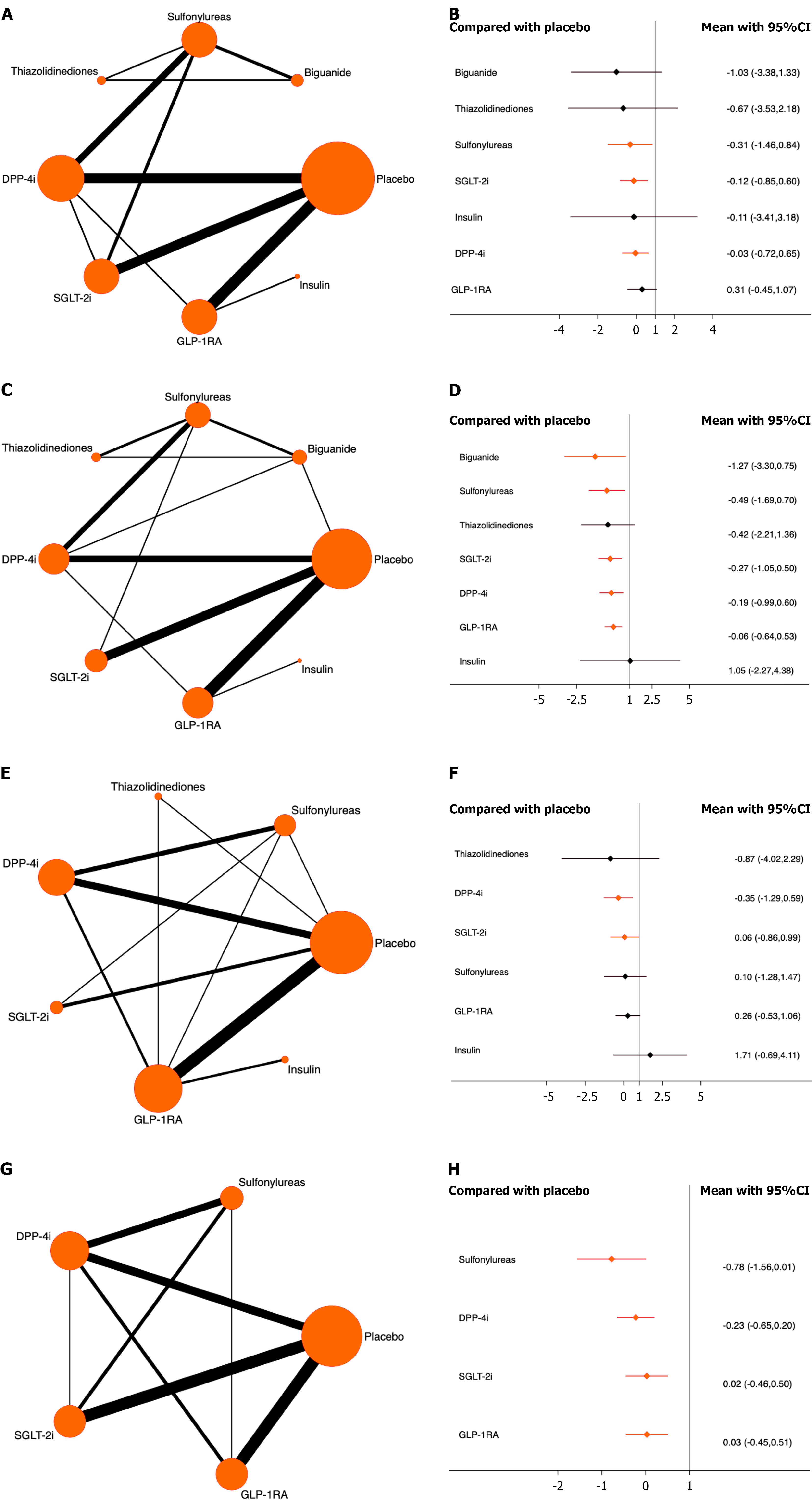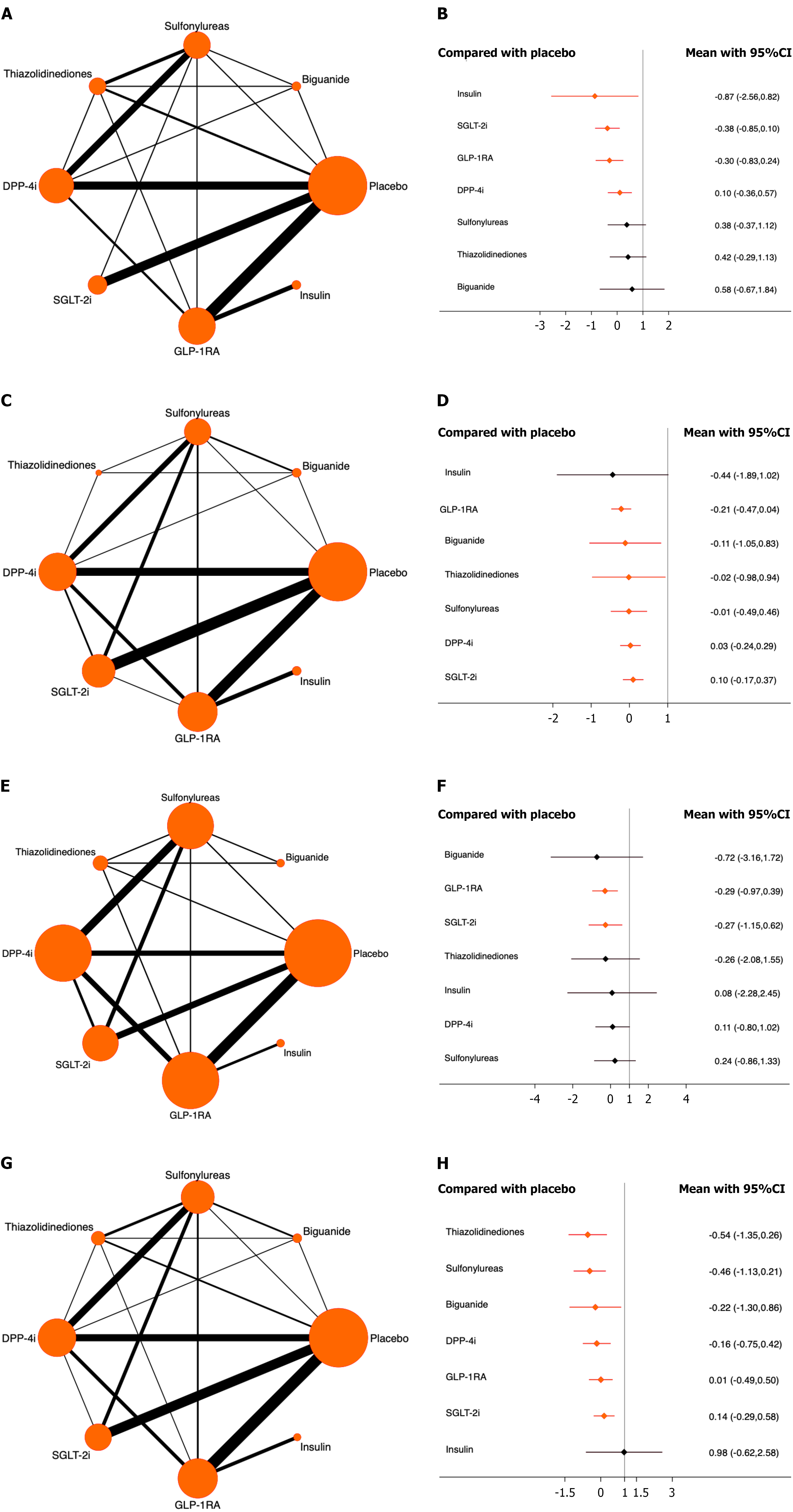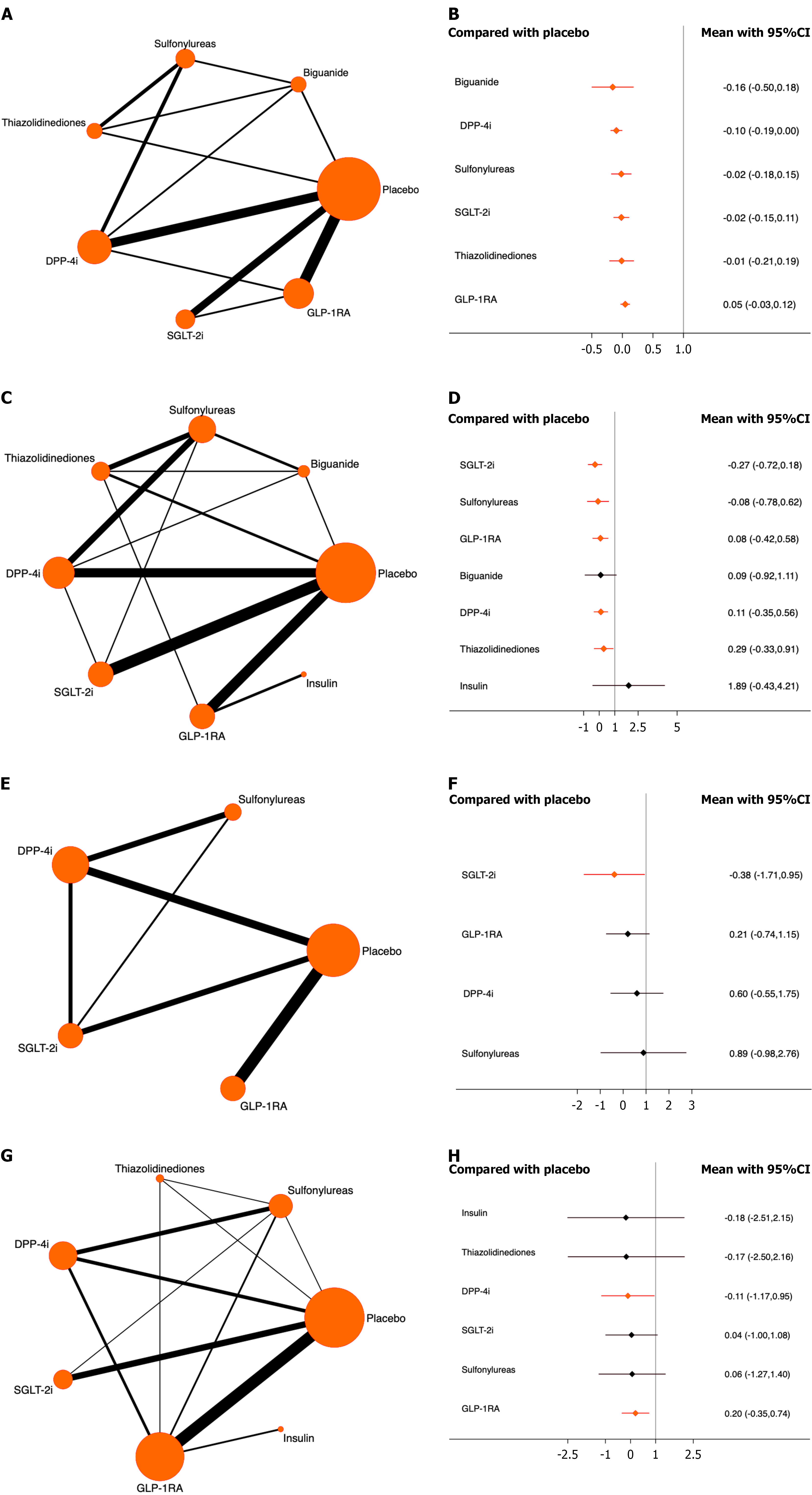 A and B: Gastric cancer; C and D: Pancreatic cancer; E and F: Rectal cancer; G and H: Colon cancer. DPP-4i: Dipeptidyl peptidase-4 inhibitors; SGLT-2i: Sodium-glucose cotransporter 2 inhibitors; GLP-1RA: Glucagon-like peptide-1 receptor agonists; CI: Confidence interval.