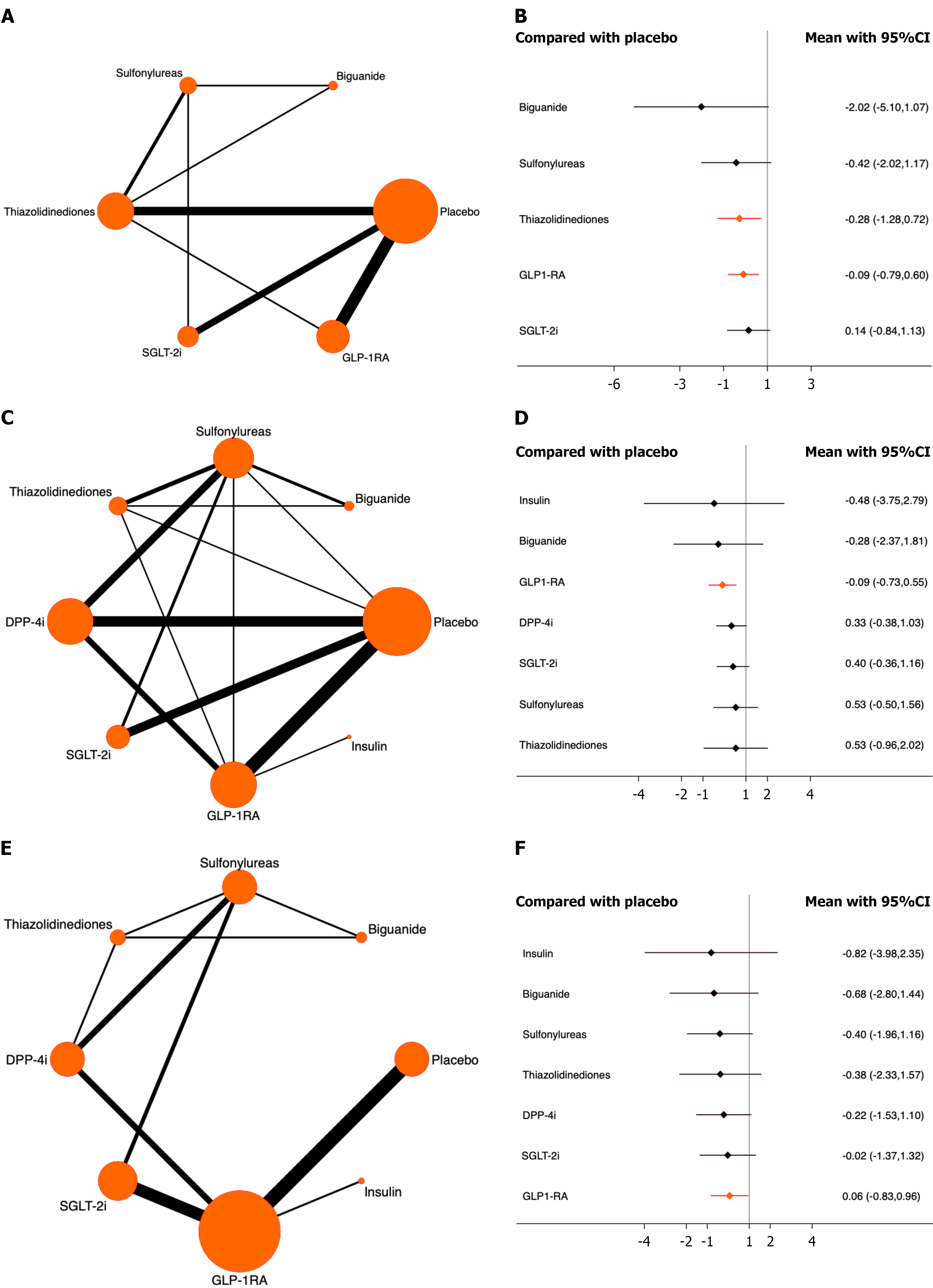 A and B: Hepatocellular cancer; C and D: Renal cancer; E and F: Hematologic cancer. DPP-4i: Dipeptidyl peptidase-4 inhibitors; SGLT-2i: Sodium-glucose cotransporter 2 inhibitors; GLP-1RA: Glucagon-like peptide-1 receptor agonists; CI: Confidence interval.