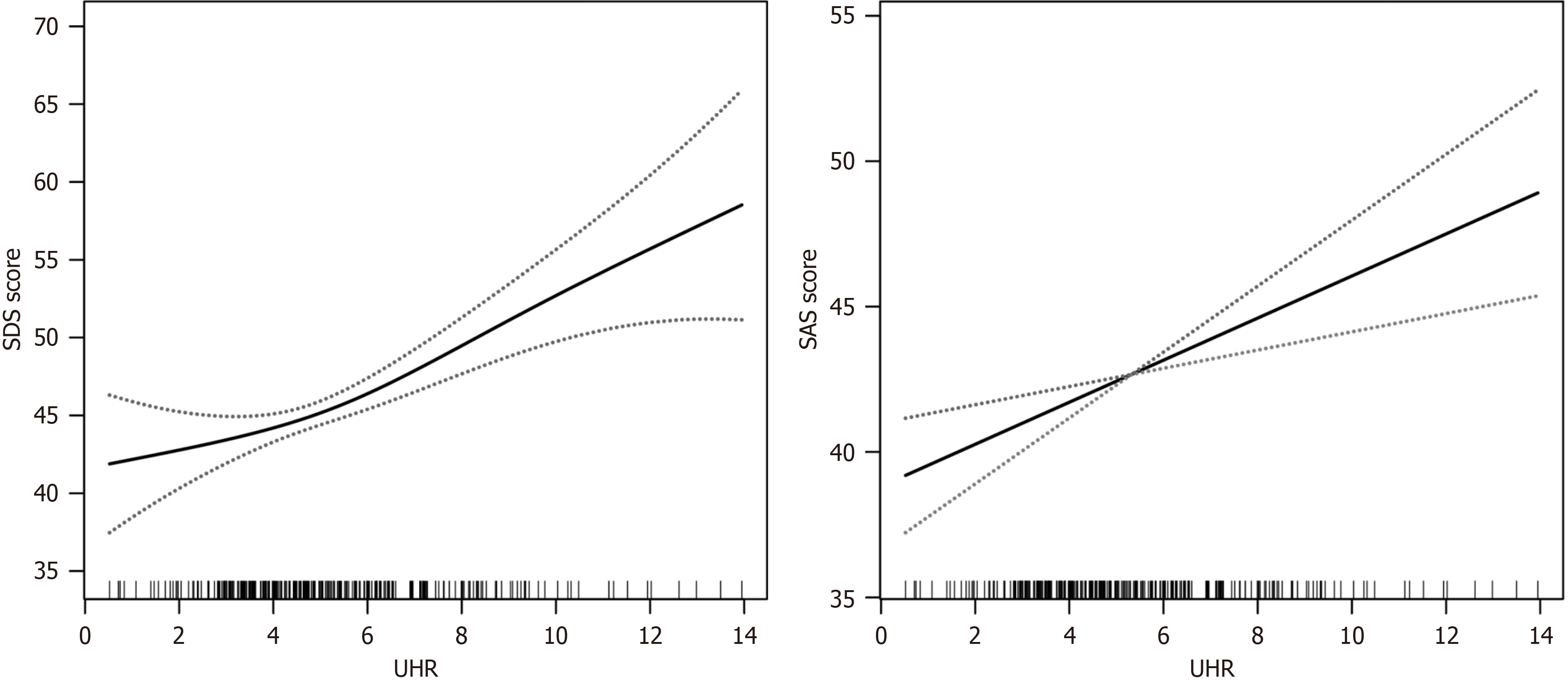 We adjusted for gender, age, education level, diabetes mellitus duration, smoking status, drinking status, body mass index, glycated hemoglobin, fasting plasma glucose, aspartate aminotransferase, alanine aminotransferase, triglycerides, total cholesterol, and low-density lipoprotein cholesterol. SAS: Self-Rating Anxiety Scale; SDS: Self-Rating Depression Scale; UHR: Uric acid to high-density lipoprotein cholesterol ratio.