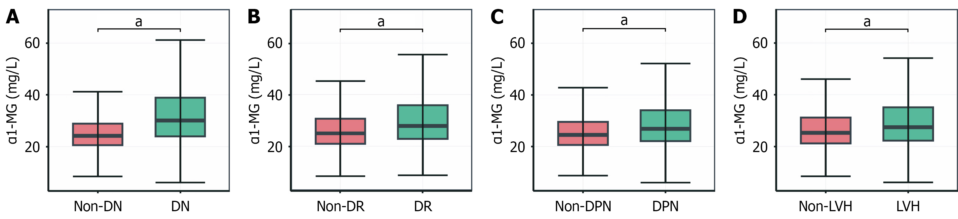 A: With and without diabetic nephropathy; B: With and without diabetic retinopathy; C: With and without diabetic peripheral neuropathy; D: With and without left ventricular hypertrophy. aP < 0.001. DN: Diabetic nephropathy; DR: Diabetic retinopathy; DPN: Diabetic peripheral neuropathy; LVH: Left ventricular hypertrophy; α1-MG: Alpha-1-microglobulin.