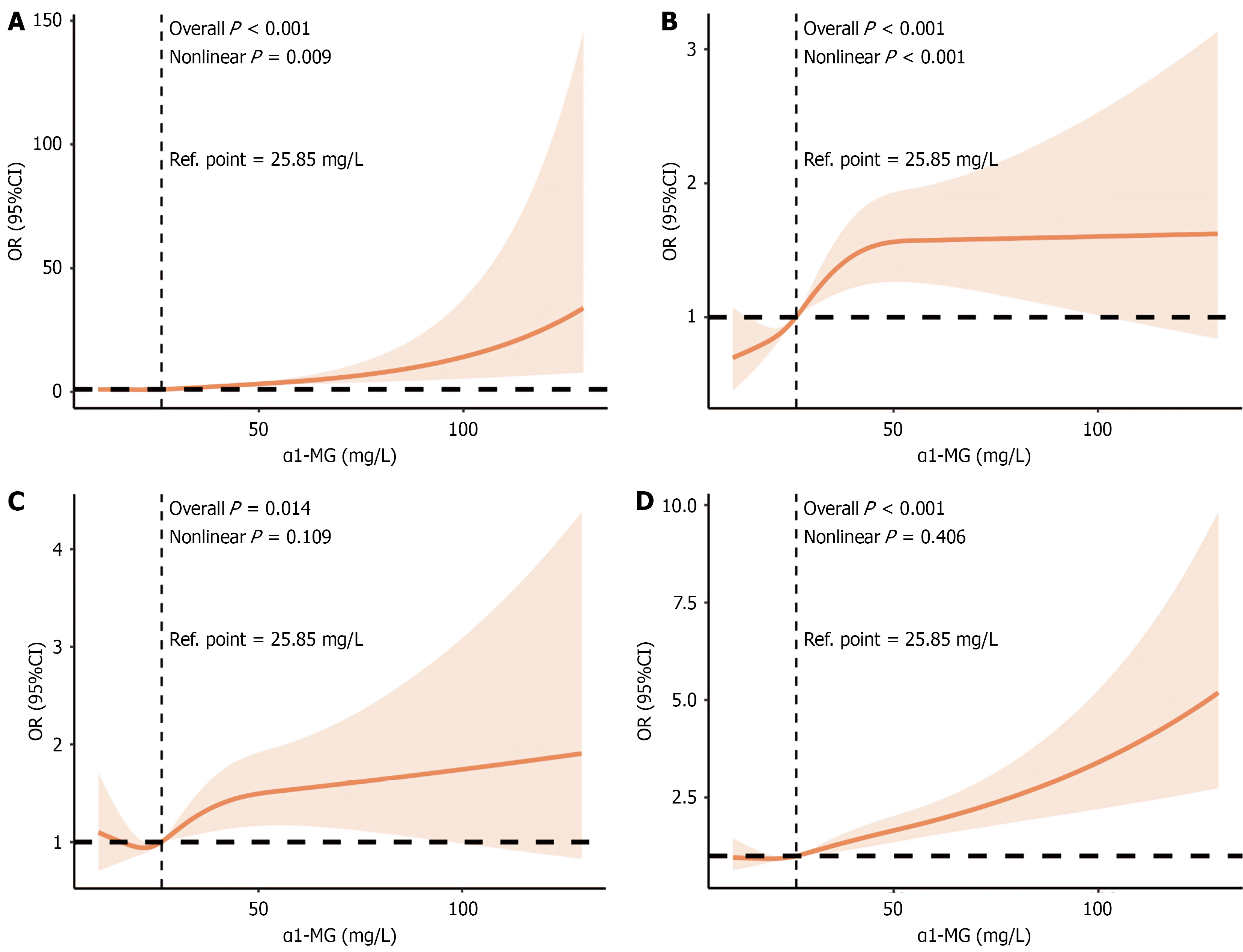 A: Diabetic nephropathy; B: Diabetic retinopathy; C: Diabetic peripheral neuropathy; D: Left ventricular hypertrophy. The models were adjusted for age, sex, body mass index, smoking, alcohol consumption, systolic blood pressure, diastolic blood pressure, hypertension, hyperlipidaemia, coronary heart disease, antihypertensive drugs, lipid-lowering drugs, antidiabetic drugs, fasting blood glucose, glycated haemoglobin, total cholesterol, triglycerides, high-density lipoprotein cholesterol, low-density lipoprotein cholesterol, uric acid, estimated glomerular filtration rate, alanine aminotransferase, aspartate aminotransferase, white blood cell, C-reactive protein, and left ventricular ejection fraction. reference values for estimation were set at median values of alpha-1-microglobulin. α1-MG: Alpha-1-microglobulin.