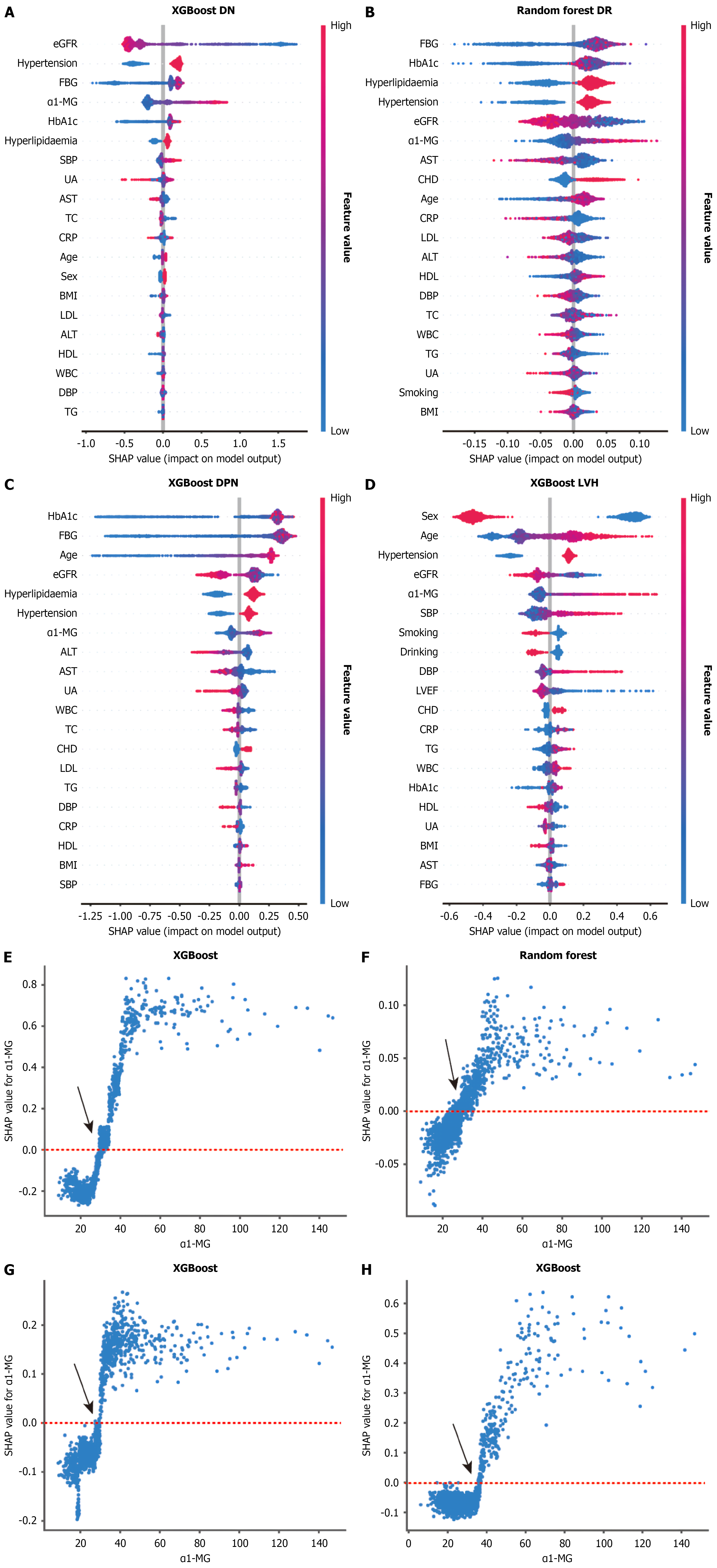 A: SHapley Additive exPlanations (SHAP) summary plot for diabetic nephropathy (DN); B: SHAP summary plot for diabetic retinopathy (DR); C: SHAP summary plot for diabetic peripheral neuropathy (DPN); D: SHAP summary plot for Left ventricular hypertrophy (LVH); E: SHAP dependence plot for DN; F: SHAP dependence plot for DR; G: SHAP dependence plot for DPN; H: SHAP dependence plot for LVH. In Figure 3A-D, each dot represents a patient, and the X-axis shows the SHAP value of the corresponding feature. For continuous variables, dot color indicates feature values, ranging from blue (low) to red (high). For categorical variables, blue denotes female sex or positive status, and red denotes male sex or negative status. In Figure 3E-H, the red dashed line represents SHAP = 0, and black arrows indicate threshold points. When the SHAP value of alpha-1-microglobulin exceeds zero, it indicates an increased risk of DN, DR, DPN, and LVH. XGBoost: Extreme gradient boosting; SHAP: SHapley Additive exPlanations; DN: Diabetic nephropathy; DR: Diabetic retinopathy; DPN: Diabetic peripheral neuropathy; LVH: Left ventricular hypertrophy; α1-MG: Alpha-1-microglobulin.