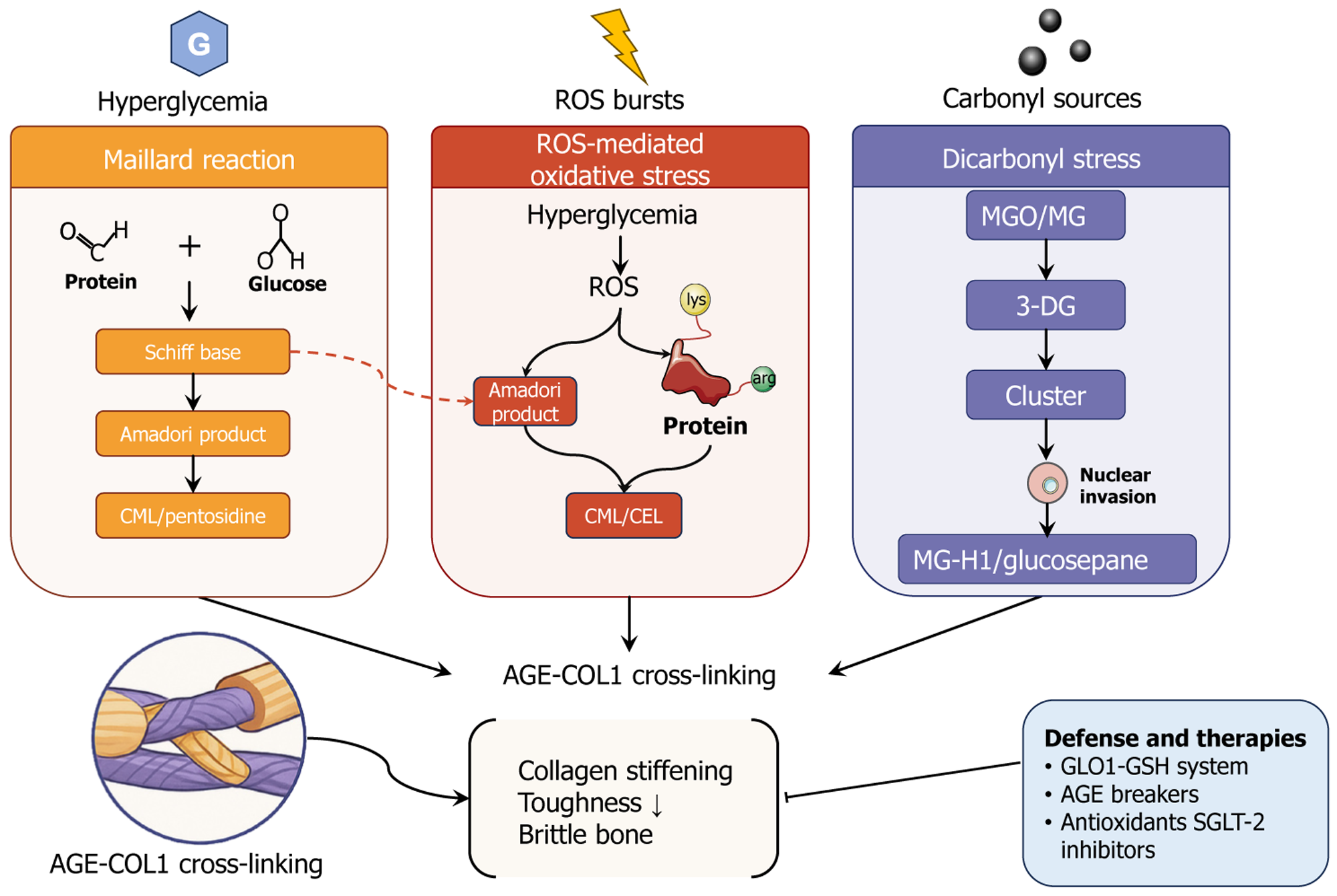 Persistent hyperglycemia initiates three chemically distinct yet convergent pathways that accelerate the accumulation of advanced glycation end products (AGEs) on type I collagen within bone: (1) Maillard reaction (orange panel): The non-enzymatic condensation of reducing sugars with protein carbonyl groups generates reversible Schiff bases, which rearrange into Amadori products and subsequently oxidize them into stable AGEs such as Nepsilon-(carboxymethyl)lysine and pentosidine; (2) Reactive oxygen species-mediated oxidative stress (red panel): Hyperglycemia-driven bursts of reactive oxygen species further oxidize Amadori products or directly modify lysine and arginine side-chains, yielding Nepsilon-(carboxymethyl)lysine and Nepsilon (carboxyethyl)lysine; and (3) Dicarbonyl stress (purple panel): Excess reactive carbonyl species (methylglyoxal, glyoxal) and their downstream 3-deoxyglucosone intermediates form intracellular clusters that can invade the nucleus and react with proteins to produce methylglyoxal-derived hydroimidazolone-1 and glucosepane cross-links. These three routes collectively intensify AGE-type I collagen crosslinking (lower left inset), which stiffens the collagen network, diminishes tissue toughness, and culminates in brittle bone (center). Endogenous and pharmacological counter-measures include the glyoxalase 1-glutathione detoxification system, chemical AGE breakers, antioxidants, and sodium-glucose cotransporter-2 inhibitors (lower right inset). CML: Nepsilon-(carboxymethyl)lysine; AGE: Advanced glycation end-product; COL1: Type I collagen; ROS: Reactive oxygen species; CEL: Nepsilon-(carboxyethyl)lysine; MGO: Methylglyoxal; MG: Glyoxal; 3-DG: 3-deoxyglucosone; MG-H1: Methylglyoxal-derived hydroimidazolone-1; GLO1: Glyoxalase 1; GSH: Glutathione; SGLT-2: Sodium-glucose cotran sporter-2; Arg: Arginine; Lys: Lysine.