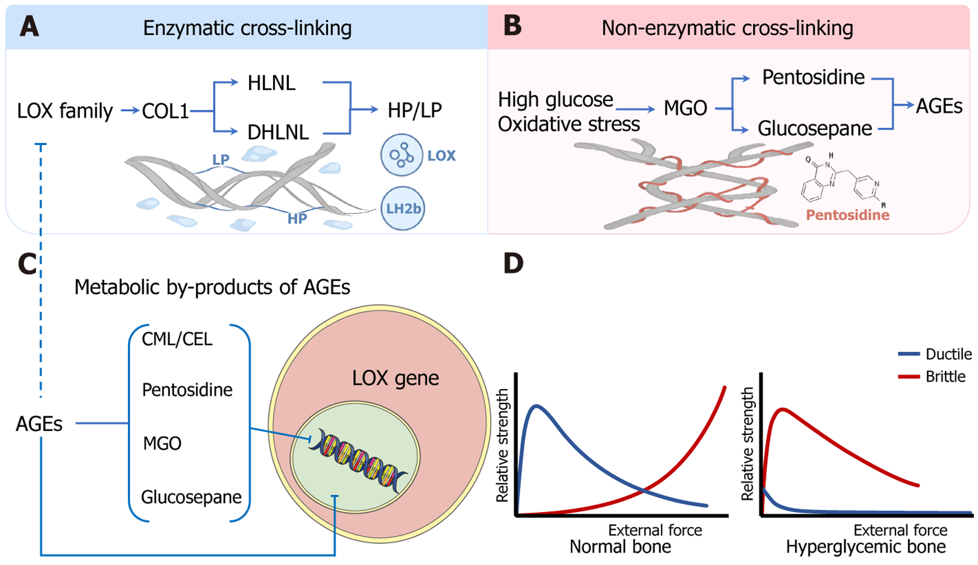 A: Enzymatic crosslinking pathway: The lysyl oxidase family catalyzes the oxidation of lysine/hydroxylysine residues on type I collagen, generating aldehydes that form initial divalent crosslinks, hydroxylysine and dihydroxylysinonorleucine, which gradually mature into trivalent pyridinoline crosslinks, including hydroxylysylpyridinoline and lysylpyridinoline, endowing the bone matrix with ductility and postyield toughness; B: Nonenzymatic crosslinking pathway: Hyperglycemia and oxidative stress promote the formation of reactive dicarbonyls such as methylglyoxal, which in turn induce advanced glycation end products (AGEs) to crosslink, such as pentosidine and glucosepane. These AGEs stiffen collagen fibrils and predispose the bone matrix to brittle failure; C: AGEs and their metabolic derivatives (e.g., Nepsilon-(carboxymethyl)lysine, Nepsilon-(carboxyethyl)lysine, pentosidine, methylglyoxal, and glucosepane) further suppress lysyl oxidase gene expression, thereby inhibiting enzymatic crosslink formation and contributing to a maladaptive “gain-loss” imbalance between the two pathways; D: In healthy bone, the enzymatic crosslinking-dominated “tough-ductile” model enables resilience under high load and strain. In contrast, diabetic bone, owing to AGE accumulation and impaired enzymatic crosslinking, presents a “stiff-brittle” mechanical profile characterized by early strength decline and insufficient energy absorption. LOX: Lysyl oxidase; COL1: Type I collagen; HLNL: Hydroxylysine; DHLNL: Dihydroxylysinonorleucine; HP: Hydroxylysylpyridinoline; LP: Lysylpyridinoline; LH2: Lysyl hydroxylase 2; MGO: Methylglyoxal; AGEs: Advanced glycation end products; CEL: Nepsilon-(carboxyethyl)lysine; CML: Nepsilon-(carboxymethyl)lysine.