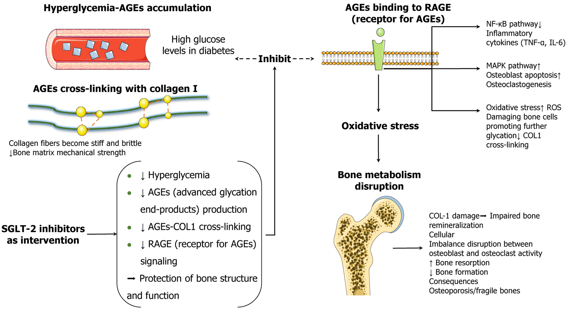Persistent hyperglycemia accelerates the accumulation of advanced glycation end product (AGEs) in both the vasculature and bone matrix, promoting nonenzymatic type I collagen (COL1). This process increases collagen fibril stiffness and brittleness, thereby compromising the mechanical integrity of the bone matrix. Excess AGEs bind to their receptor, triggering downstream inflammatory and apoptotic pathways, including nuclear factor-κB and mitogen-activated protein kinase signaling, and amplifying reactive oxygen species-mediated oxidative stress. These cascades impair osteoblast function, promote osteoclast differentiation, and lead to reduced bone formation, enhanced bone resorption, and degradation of the COL1 structure, ultimately resulting in disrupted bone remodeling and osteoporosis. Sodium-glucose cotransporter 2 inhibitors not only reduce blood glucose levels but also suppress AGE formation, inhibit AGE-COL1 crosslinking, and downregulate receptor for advanced glycation end products signaling. Collectively, these effects help preserve bone structure and function in diabetic conditions. AGEs: Advanced glycation end products; SGLT-2: Sodium-glucose cotransporter 2; COL1: Type I collagen; RAGE: Receptor for advanced glycation end products; NF-κB: Nuclear factor-κB; MAPK: Mitogen-activated protein kinase; IL-6: Interleukin 6; TNF-α: Tumor necrosis factor α; ROS: Reactive oxygen species.