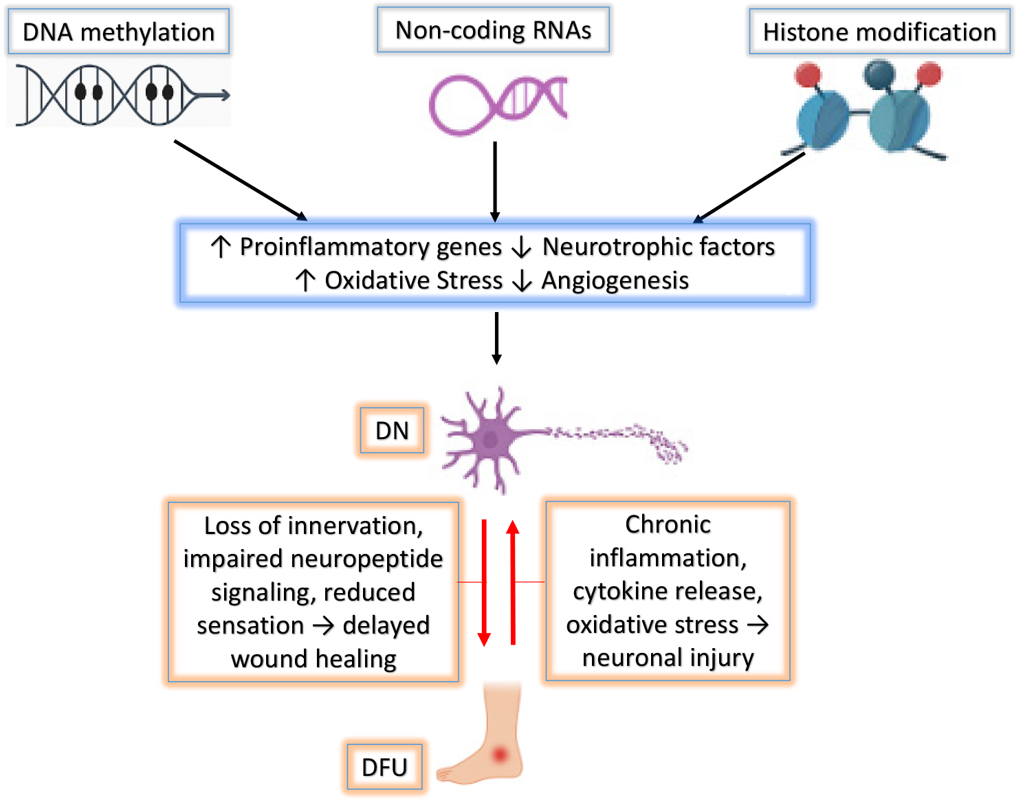 This schematic illustrates the interplay between major epigenetic modifications (DNA methylation, histone modifications, and non-coding RNAs) in driving chronic inflammation, oxidative stress, impaired neurovascular repair, and tissue degeneration. These processes contribute to the development and persistence of diabetic neuropathy (DN) and diabetic foot ulcers (DFUs) by disrupting key protective pathways and promoting pathological gene expression.