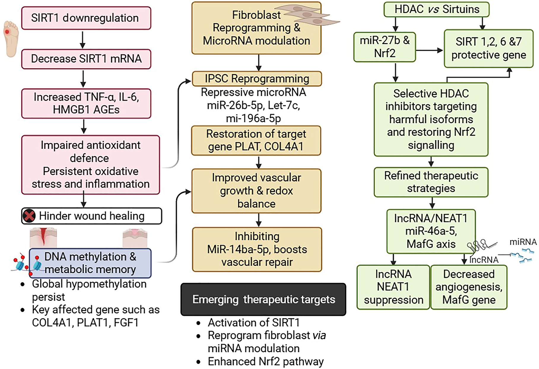 SIRT1 downregulation leads to elevated pro-inflammatory mediators and oxidative stress, which impairs wound healing. Persistent DNA hypomethylation, despite normoglycemia, sustains metabolic memory and represses key reparative genes (e.g., collagen type IV alpha 1 [COL4A1], plasminogen activator, tissue type 1 [PLAT1], and fibroblast growth factor 1 [FGF1]). Reprogramming fibroblasts through modulation of microRNAs (e.g., miR-26b-5p, let-7c, miR-196a-5p) restores pro-repair gene expression, improves redox balance, and promotes vascular repair. Additionally, targeting the histone deacetylase (HDAC)–sirtuin axis via selective HDAC inhibition and enhancing Nrf2 signaling refines therapeutic strategies. Suppression of long non-coding RNA (lncRNA) nuclear enriched abundant transcript 1 (NEAT1) and modulation of the miR-46a-5–MafG axis further improve angiogenesis. Together, these insights identify promising therapeutic avenues.