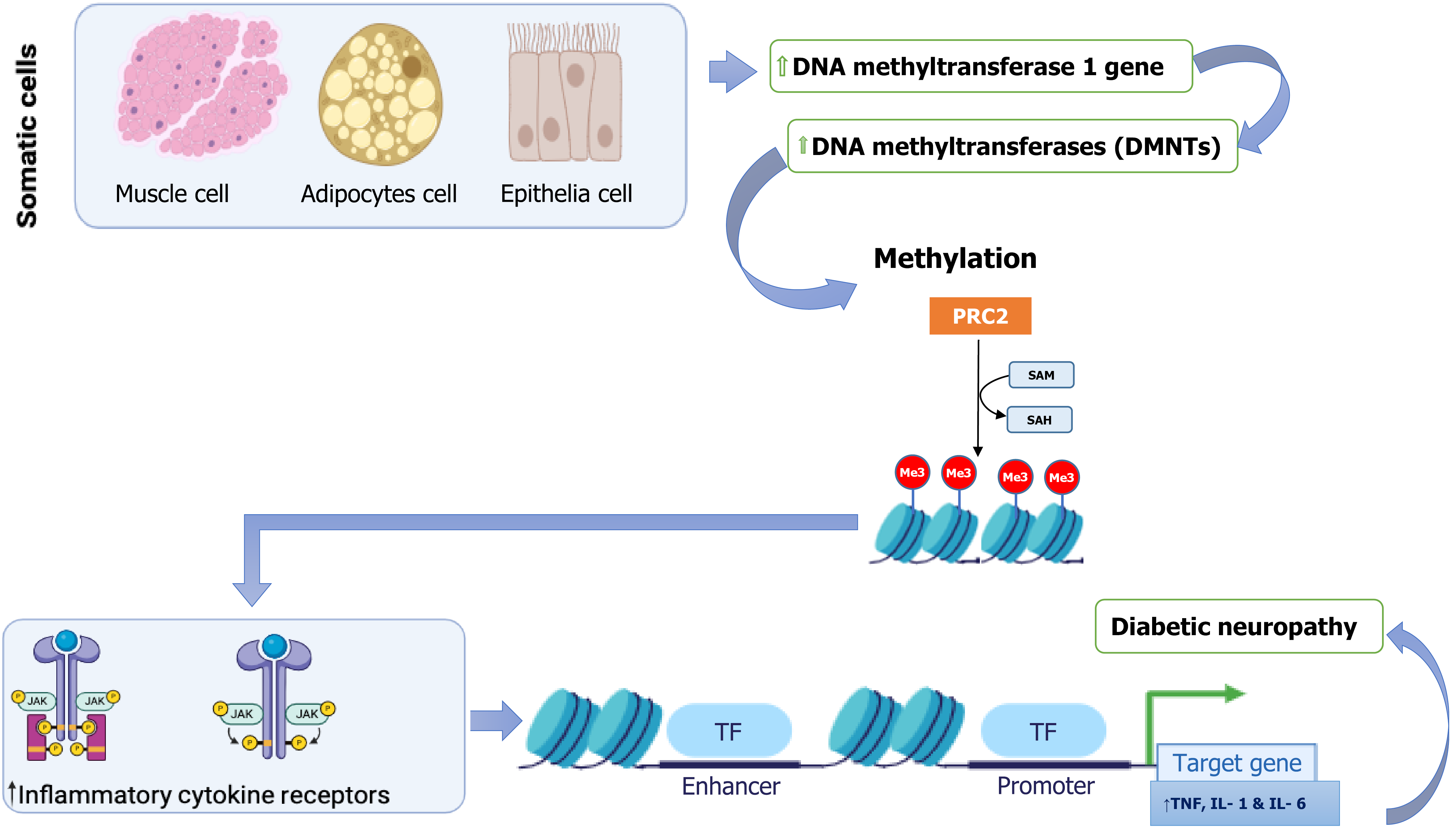 This schematic illustrates the role of aberrant DNA methylation in promoting inflammatory signaling pathways implicated in diabetic neuropathy. In somatic cells (muscle, adipocytes, epithelial), hyperactivation of DNA methylation machinery, including DNA-methyltransferase 1 (DNMT1) and other DNMTs, leads to increased chromatin methylation. The polycomb repressive complex 2 (PRC2) and S-adenosylmethionine (SAM) facilitate histone methylation (Me3) at key regulatory loci, repressing transcriptional activity by RNA polymerase II (RNAPII). This epigenetic repression alters immune signaling pathways, particularly by upregulating inflammatory cytokine receptors (e.g., Janus kinase/signal transducer and activator of transcription signaling), which in turn enhances transcription of pro-inflammatory cytokine genes, including tumor necrosis factor (TNF), interleukin 1 (IL-1), and IL-6. The persistent expression of these inflammatory mediators contributes to chronic neuroinflammation and the progression of diabetic neuropathy.