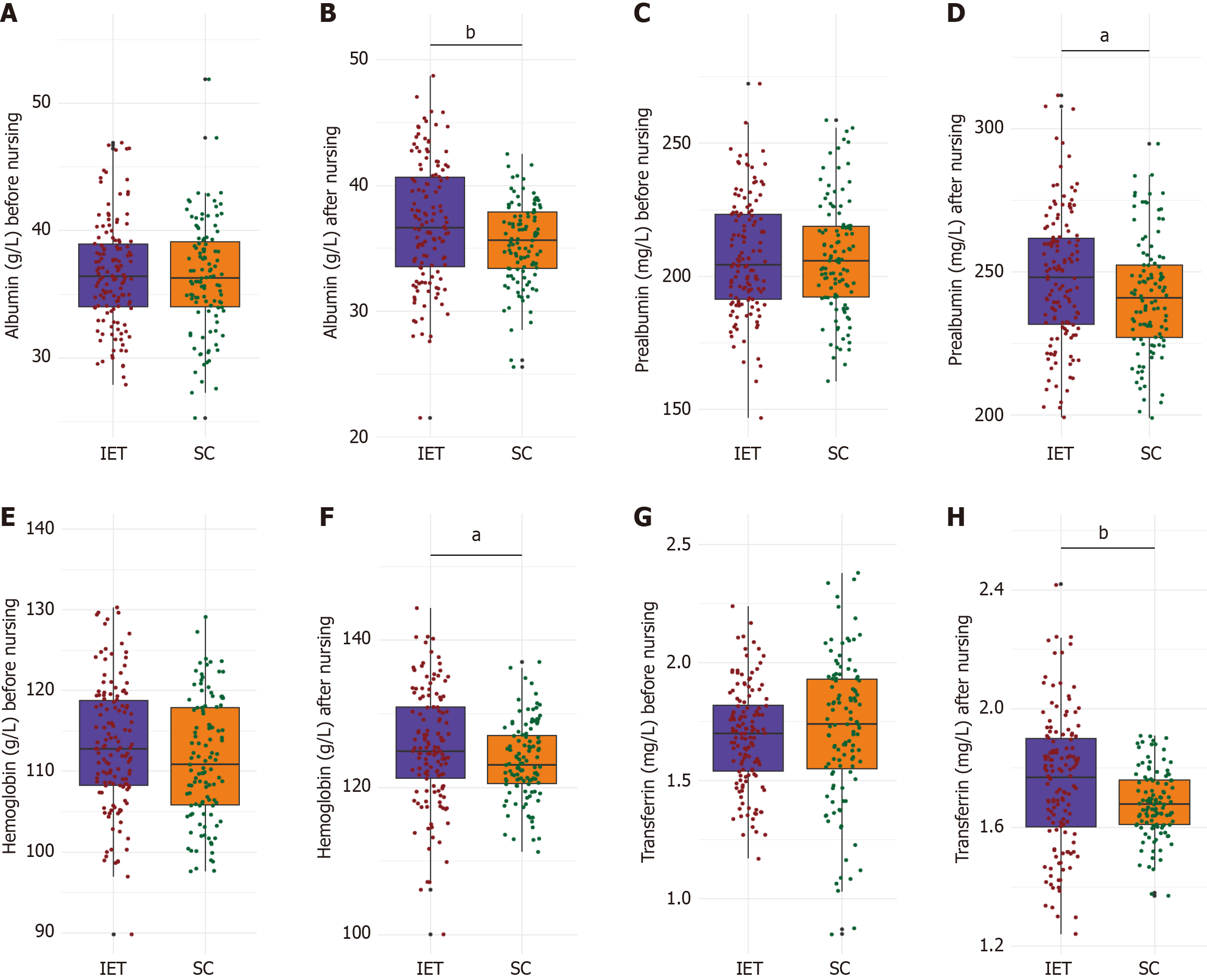 A: Before-albumin (g/L); B: After-albumin (g/L); C: Before-prealbumin (mg/L); D: After-prealbumin (mg/L); E: Before-hemoglobin (g/L); F: After-hemoglobin (g/L); G: Before-transferrin (mg/L); H: After-transferrin (mg/L). IET: Individualized exercise training; SC: Standard care. aP < 0.05, and bP < 0.01.