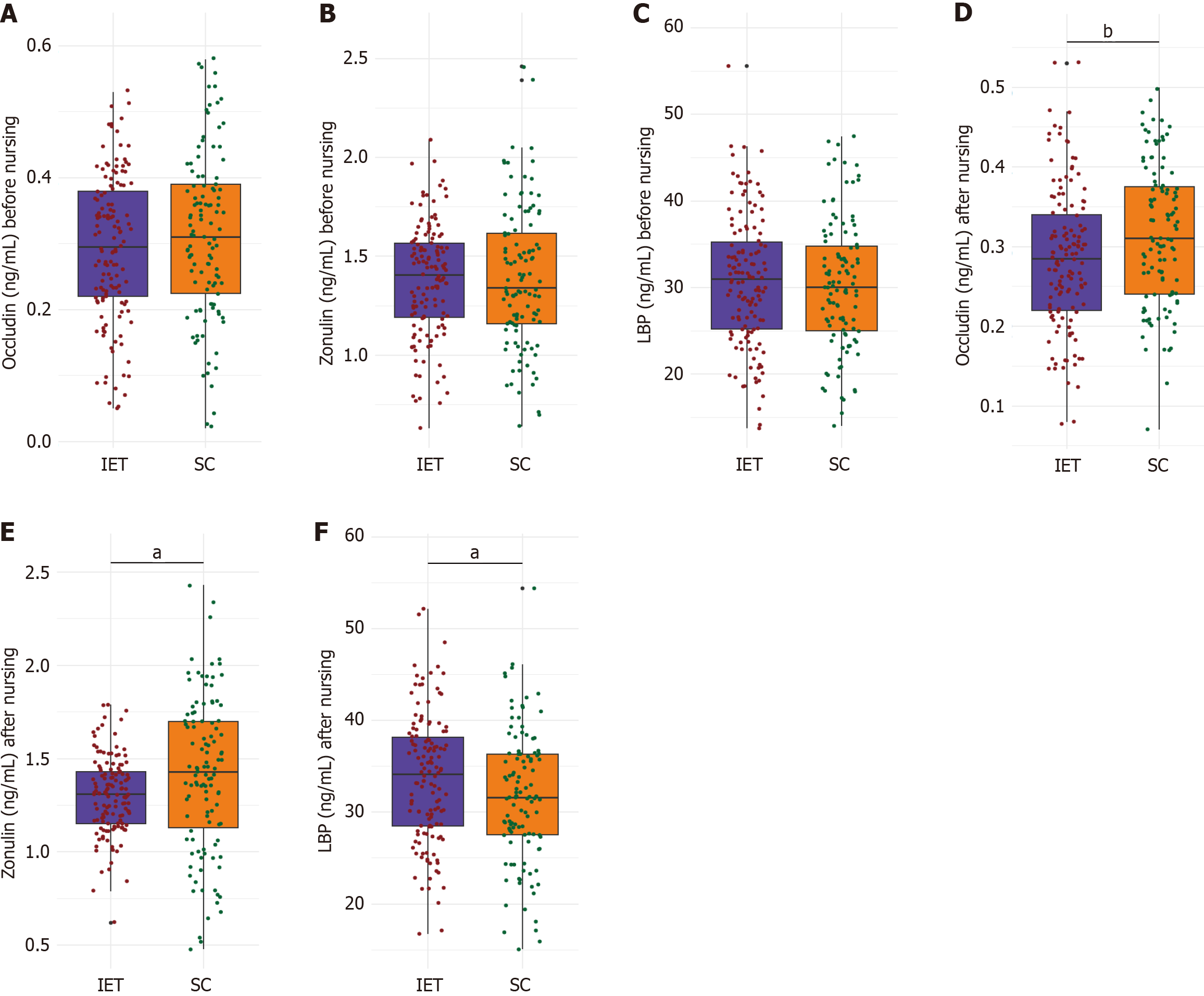 A: Before-occludin (ng/mL); B: Before-zonulin (ng/mL); C: Before-lipopolysaccharide binding protein (ng/mL); D: After-occludin (ng/mL); E: After-zonulin (ng/mL); F: After-lipopolysaccharide binding protein (ng/mL). LBP: Lipopolysaccharide binding protein; IET: Individualized exercise training; SC: Standard care. aP < 0.05, and bP < 0.01.
