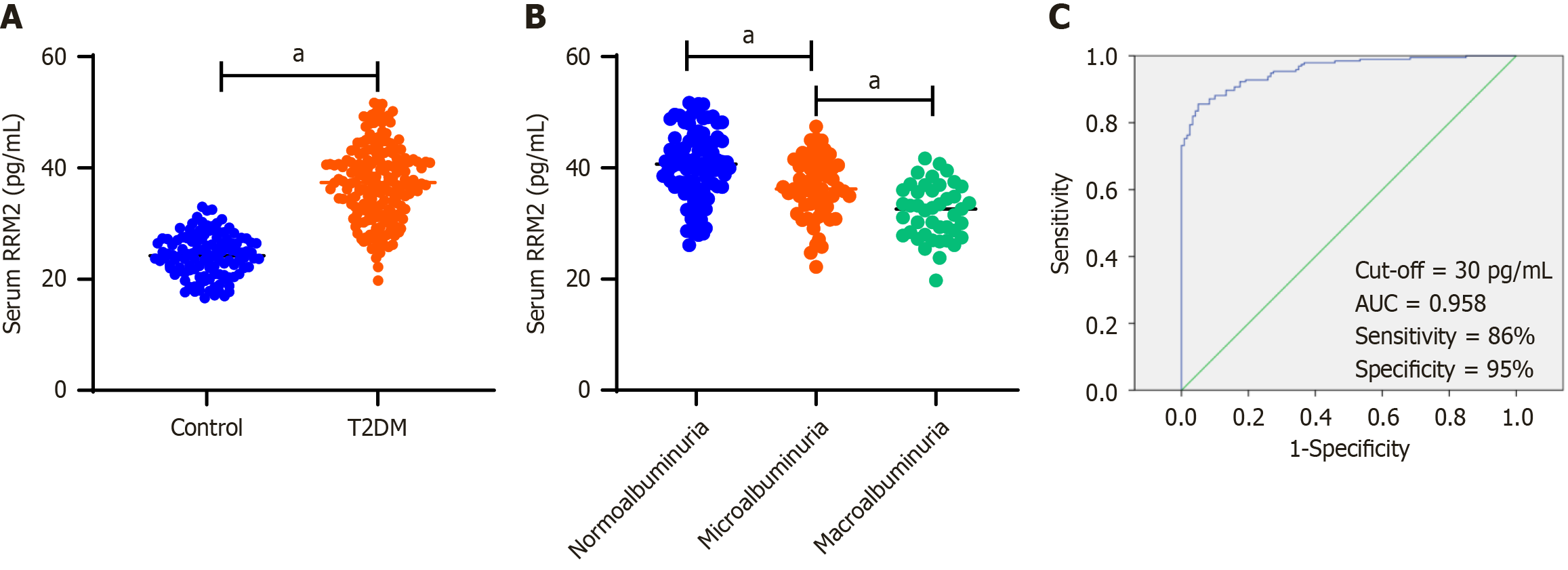 A: Comparison of serum ribonucleotide reductase regulatory subunit M2 (RRM2) levels between control subjects and type 2 diabetes mellitus (T2DM) patients. The serum RRM2 concentration in T2DM patients (n = 194) was significantly higher than that in the control subjects (n = 120). The t-test was applied; B: Comparison of serum RRM2 levels among the three subgroups of T2DM patients. Serum RRM2 concentration in patients with macroalbuminuria (n = 43) was significantly lower than that in patients with normoalbuminuria (n = 93) and microalbuminuria (n = 58). ANOVA was applied; C: The receiver operating characteristic curve was used to obtain the optimal cutoff value of serum RRM2 (30 pg/mL) that distinguishes T2DM patients from healthy controls. aP < 0.001. RRM2: Ribonucleotide reductase regulatory subunit M2; T2DM: Type 2 diabetes mellitus.