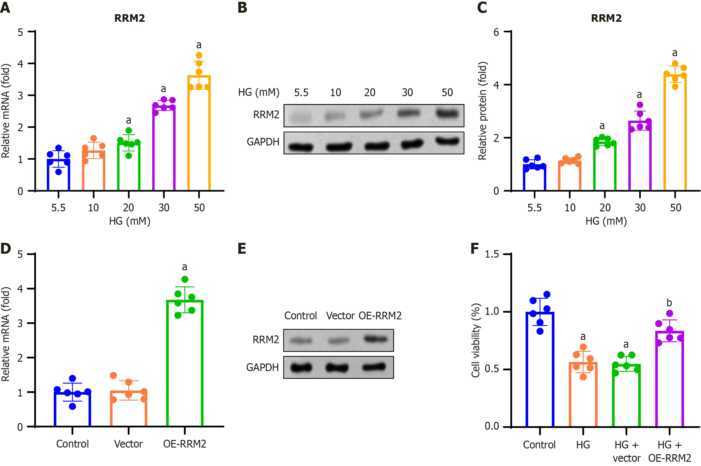 HK-2 cells were treated with 5.5, 10, 20, 30, and 50 mmol/L D-glucose for 48 hours. A: Ribonucleotide reductase regulatory subunit M2 (RRM2) mRNA expression was determined using reverse transcription quantitative PCR (RT-qPCR); B: Representative gel blots of RRM2 obtained by Western blotting; C: RRM2 protein blots were quantified by normalizing to GAPDH; D and E: HK-2 cells were transfected with pCDH-CMV-RRM2 or an empty vector, and RT-qPCR and Western blotting were performed 48 hours after transfection; F: HK-2 cells were transfected with pCDH-CMV-RRM2 or an empty vector and treated with high glucose (HG; 30 mmol/L) for 48 hours. The effect of RRM2 overexpression on cell viability was assessed using MTT assay. Data are presented as mean ± SD in triplicate and analyzed using one-way ANOVA. aP < 0.001 vs HG (5.5 mM) group or control group; bP < 0.001 vs HG + vector. RRM2: Ribonucleotide reductase regulatory subunit M2; HG: High glucose; OE-RRM2: Overexpressing ribonucleotide reductase regulatory subunit M2.