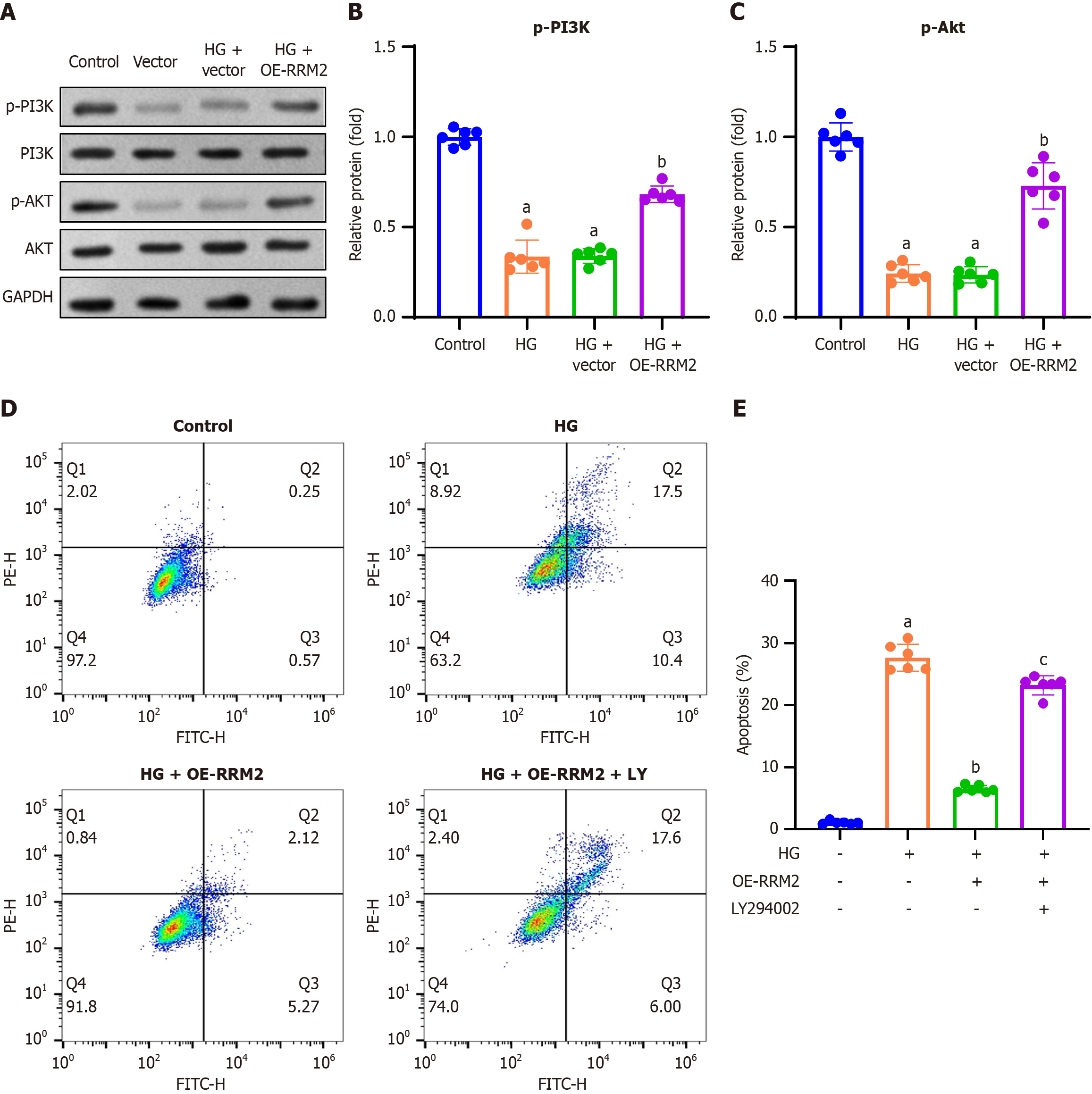 A: Representative gel blots of phosphorylated PI3K (p-PI3K, p85, Tyr458) and Akt (p-Akt, Ser473); B and C: Quantification of p-PI3K (normalized to total PI3K) and p-Akt (normalized to total Akt) levels. HK-2 cells were transfected with pCDH-CMV-ribonucleotide reductase regulatory subunit M2 (RRM2) or an empty vector and co-treated with the PI3K/Akt pathway inhibitor LY294002 (10 μM) and high glucose (HG; 30 mmol/L) for 48 hours; D: Cell apoptosis was assessed by Annexin V-FITC double staining and analyzed using flow cytometry; E: Apoptotic rate was calculated by summing the number of early apoptotic cells (lower right quadrant) and late apoptotic cells (upper right quadrant). Data are presented as mean ± SD in triplicate and analyzed using one-way ANOVA. aP < 0.001 vs control group; bP < 0.001 vs HG group; cP < 0.001 vs HG + OE-RRM2 group. HG: High glucose; OE-RRM2: Overexpressing ribonucleotide reductase regulatory subunit M2.