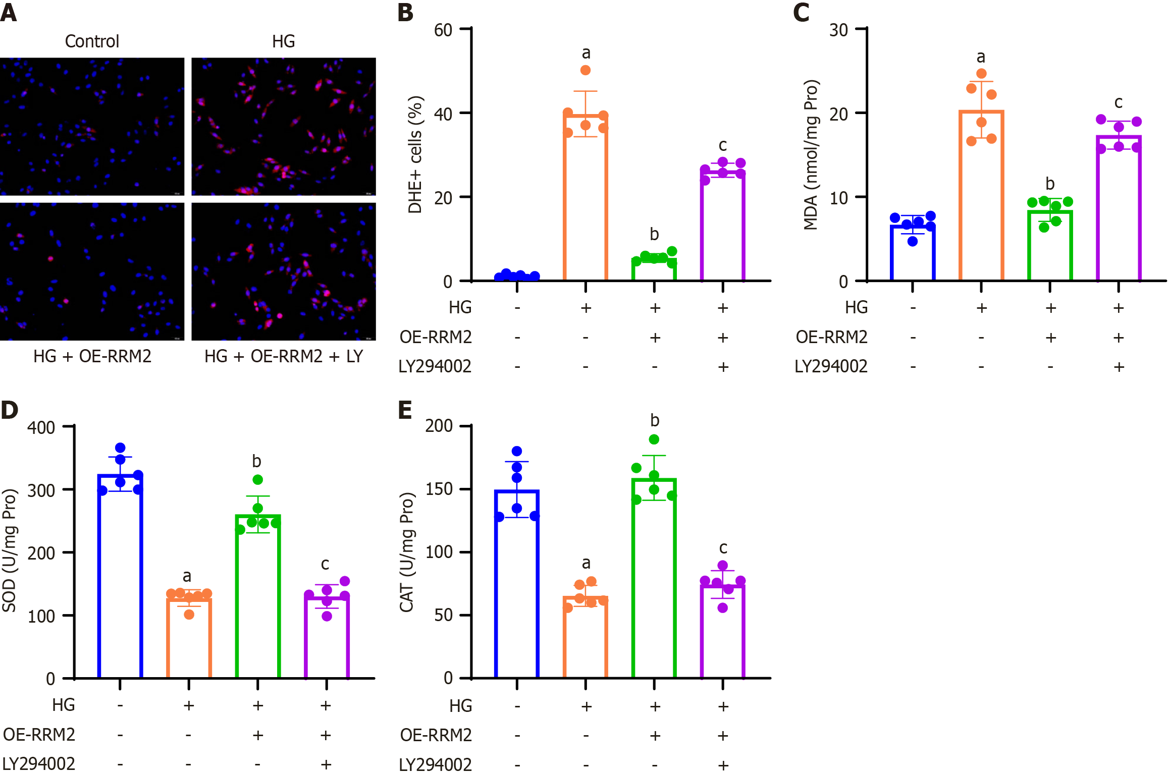 A: Representative images of dihydroergotamine (DHE) staining of HK-2 cells; B: Quantification of DHE-positive cells relative to DAPI-positive cells in the different groups; C-E: The colorimetric method was applied to analyze oxidative stress indicators in the lysate of HK-2 cells, and the levels of malondialdehyde (C), superoxide dismutase (D), and catalase (E) were measured. Data are presented as mean ± SD in triplicate and analyzed using one-way ANOVA. aP < 0.001 vs control group; bP < 0.001 vs high glucose (HG) group; cP < 0.001 vs HG + OE-ribonucleotide reductase regulatory subunit M2 group. HG: High glucose; OE-RRM2: Overexpressing ribonucleotide reductase regulatory subunit M2; DHE: Dihydroergotamine; MDA: Malondialdehyde; SOD: Superoxide dismutase; CAT: Catalase.