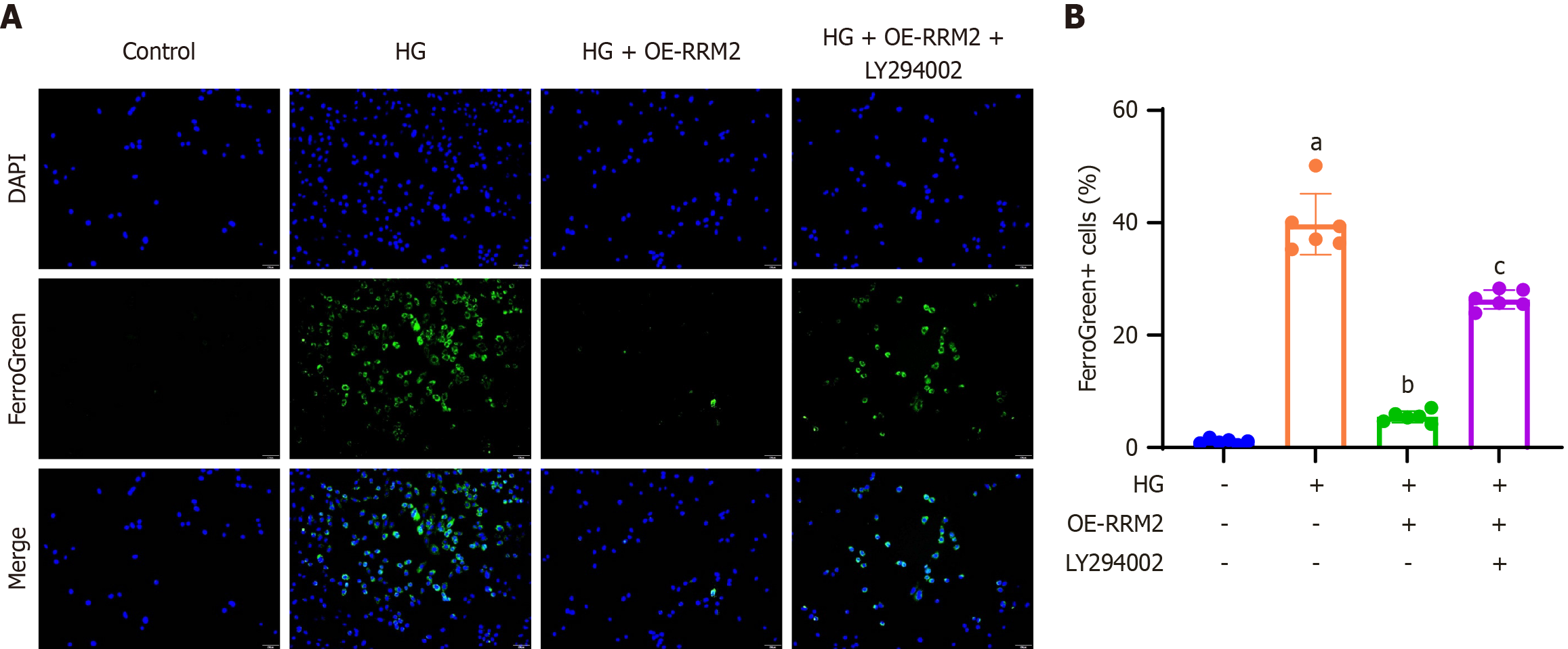 A: HK-2 cells were stained with Mito FerroGreen to visualize mitochondrial ferrous iron using green fluorescence. A representative image of FerroGreen-positive cells is shown (200 × magnification); B: Quantification of the percentage of FerroGreen-positive cells relative to DAPI-positive cells. Data are presented as mean ± SD in triplicate and analyzed using one-way ANOVA. aP < 0.001 vs control group; bP < 0.001 vs high glucose (HG) group; cP < 0.001 vs HG + OE- ribonucleotide reductase regulatory subunit M2 group. HG: High glucose; OE-RRM2: Overexpressing ribonucleotide reductase regulatory subunit M2.