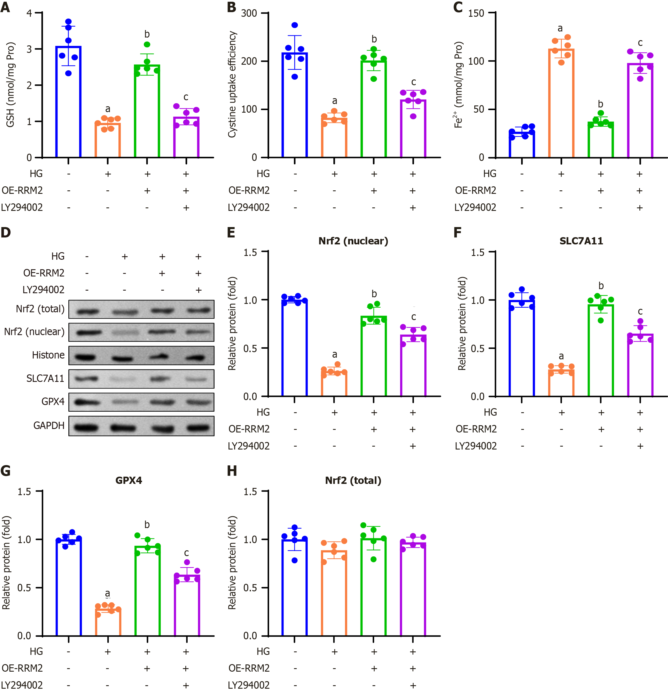 A: Colorimetric method was used to analyze the glutathione content; B: Cystine uptake capacity was measured in high glucose (HG)-treated HK-2 cells; C: The concentration of Fe2+ was measured in the HG-treated HK-2 cells; D: Western blotting was performed to determine ferroptosis-related proteins; E-H: Nrf2 (E; nuclear, normalized to histone), SLC7A11 (F) GPX4 (G), and quantification of Nrf2 (H; total, normalized to GAPDH). Data are presented as mean ± SD in triplicate and analyzed using one-way ANOVA. aP < 0.001 vs control group; bP < 0.001 vs HG group; cP < 0.001 vs HG + overexpressing-ribonucleotide reductase regulatory subunit M2 group. HG: High glucose; OE-RRM2: Overexpressing ribonucleotide reductase regulatory subunit M2; GSH: Glutathione.