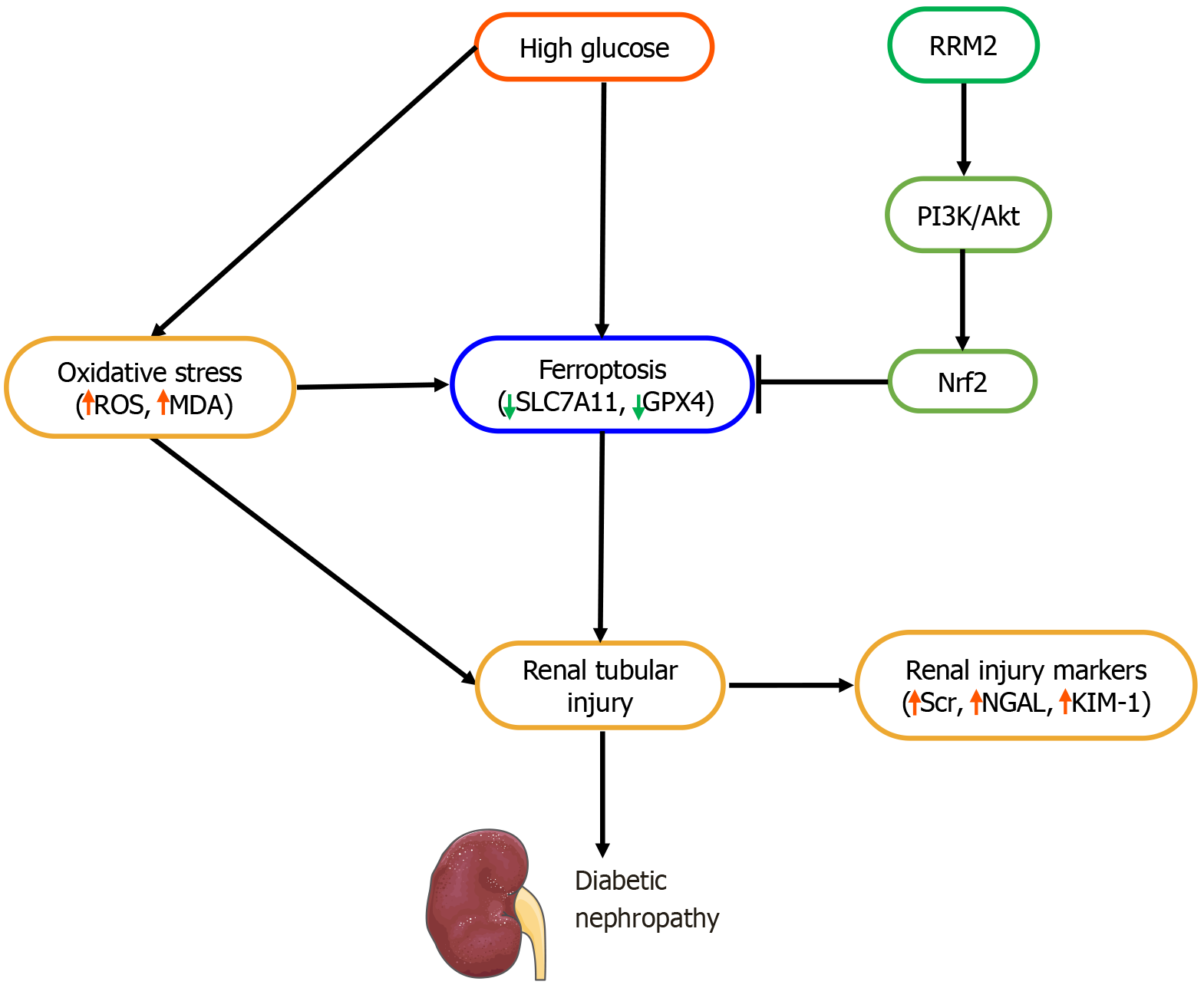 ROS: Reactive oxygen species; MDA: Malondialdehyde; SLC7A11: Solute carrier family 7 member 11; GPX4: Glutathione peroxidase 4; RRM2: Ribonucleotide reductase regulatory subunit M2; Scr: Serum creatinine; NGAL: Neutrophil gelatinase-associated lipocalin; KIM-1: Kidney injury molecule-1.