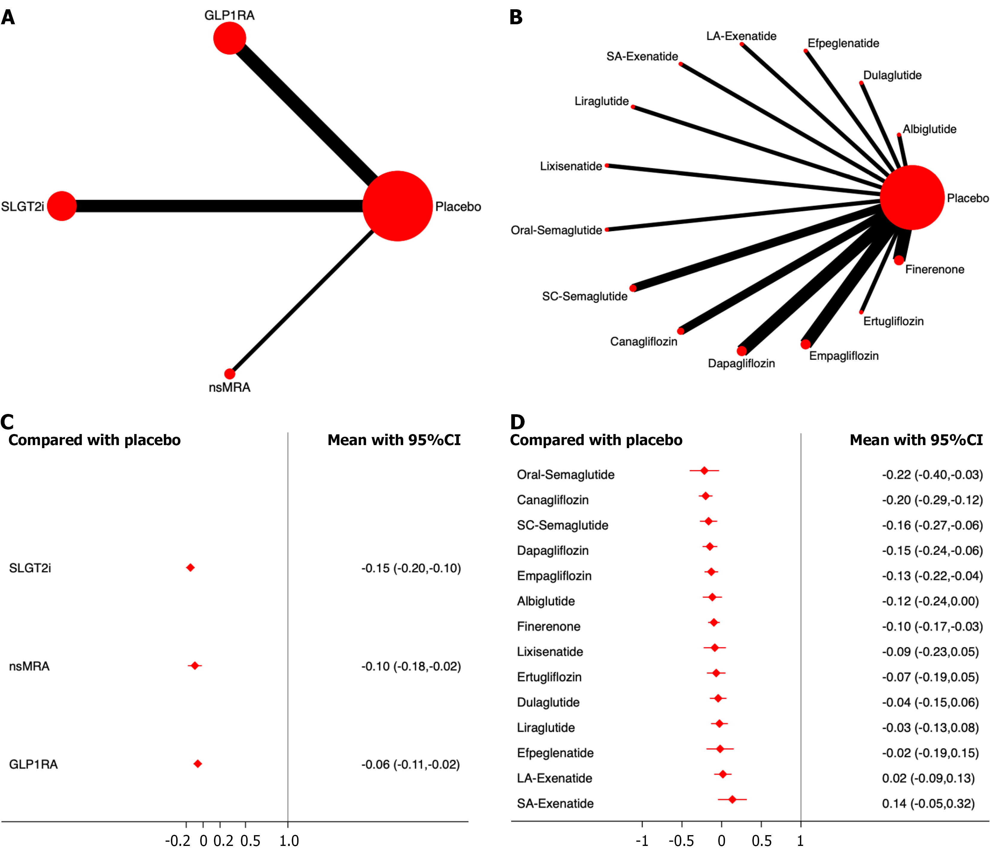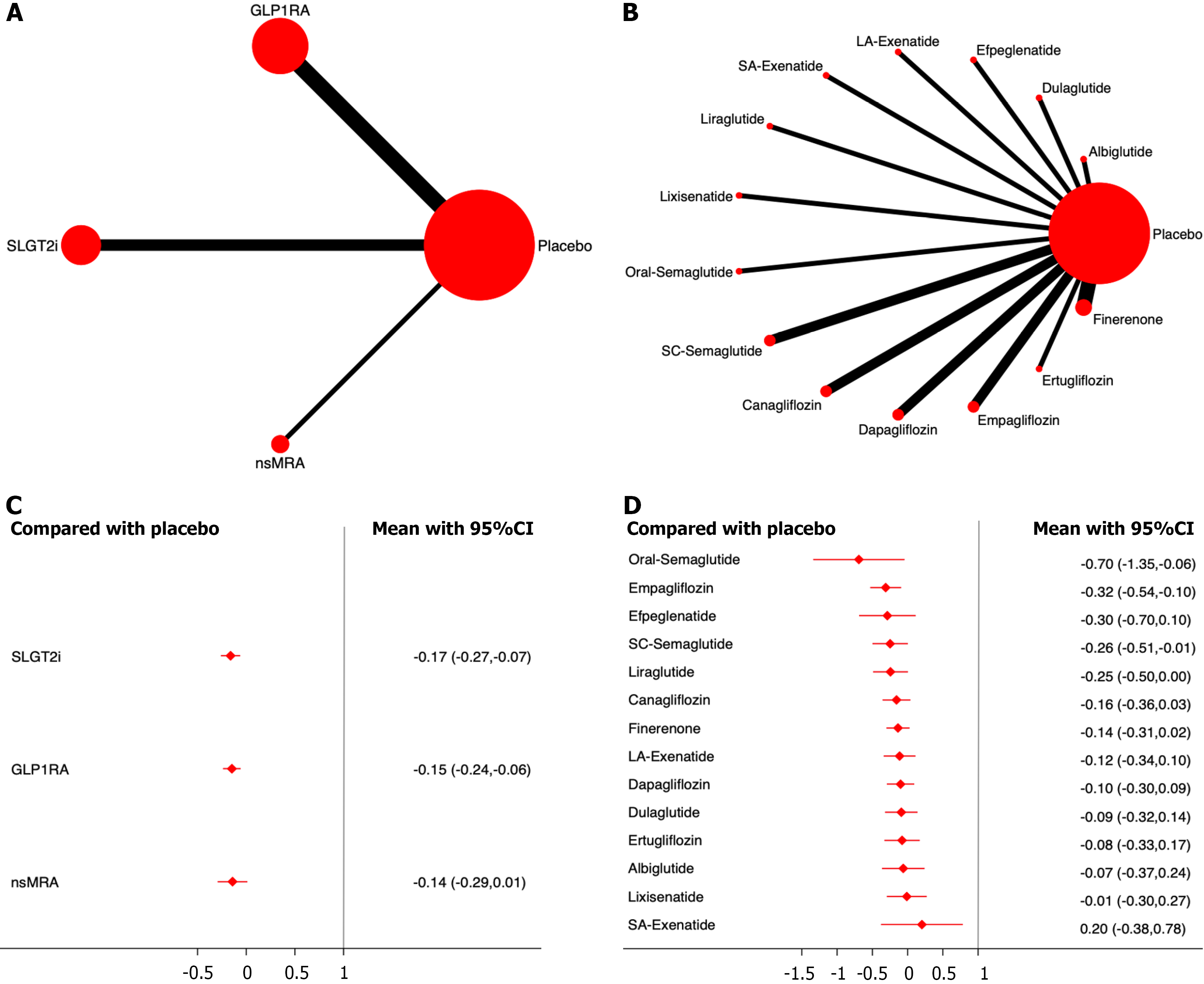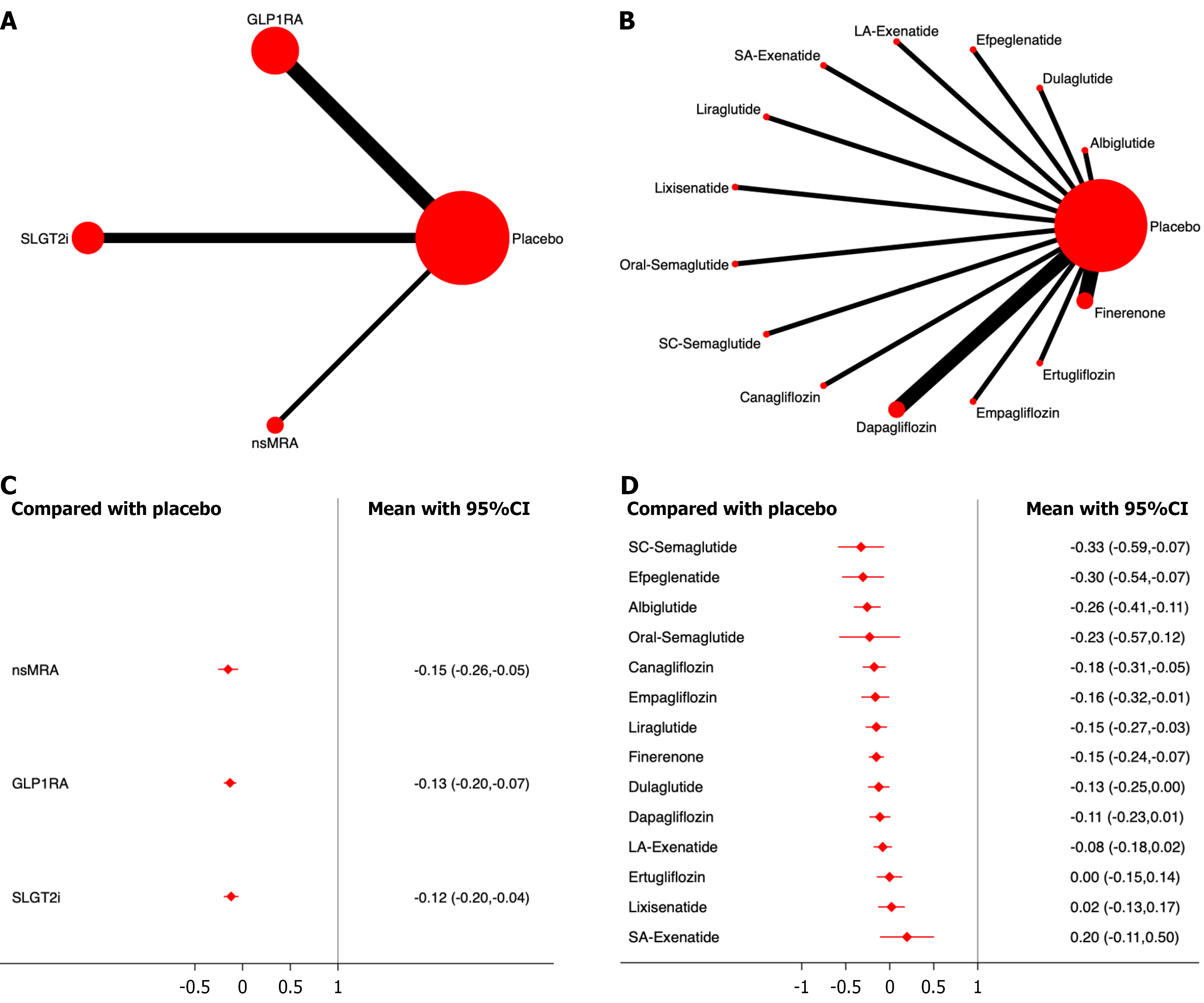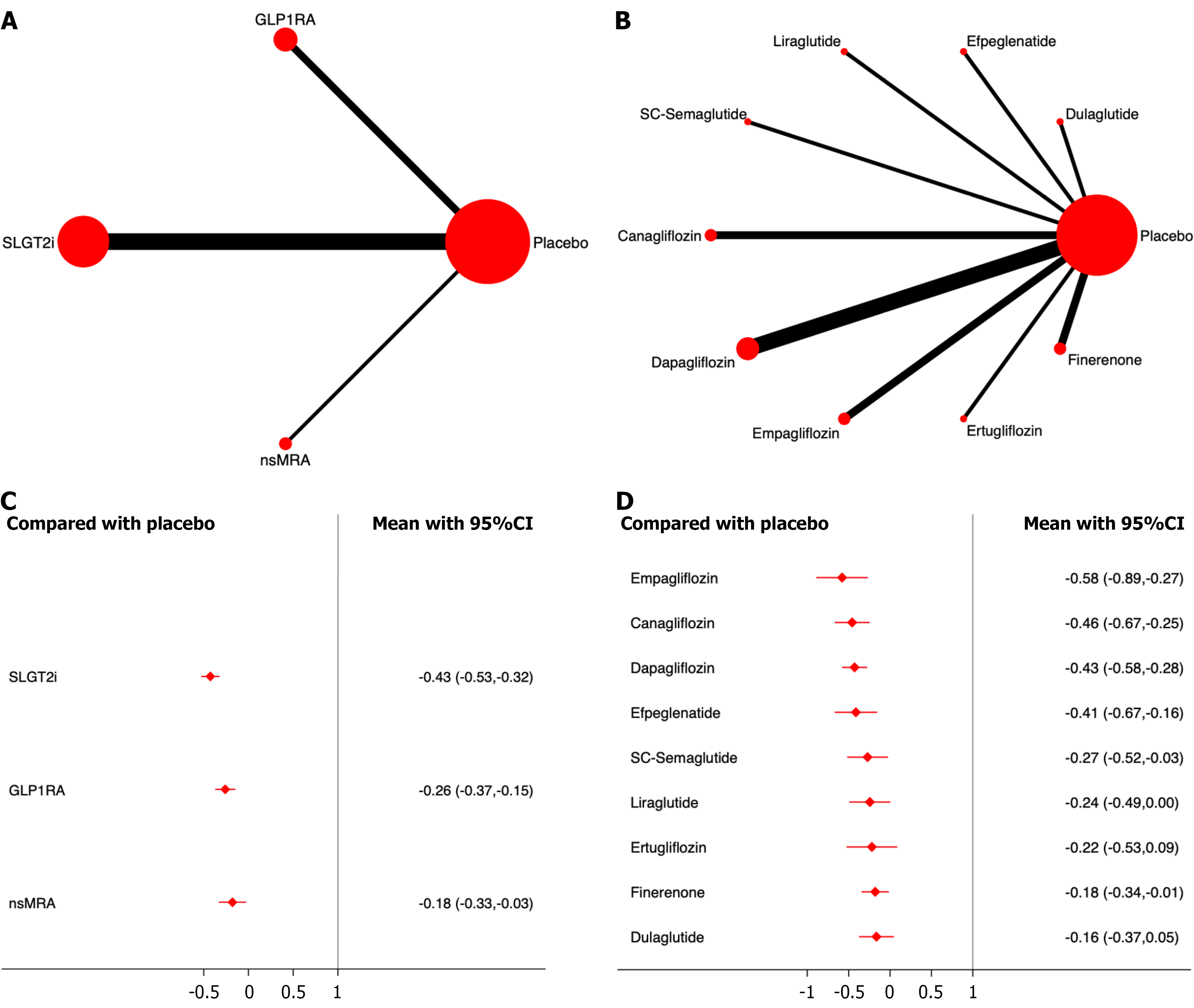A: Comparison network results for progression of proteinuria of three classes of drugs; B: Comparison network results for progression of proteinuria of different drugs; C: Forest plot for progression of proteinuria of three classes of drugs; D: Forest plot for progression of proteinuria of different drugs.