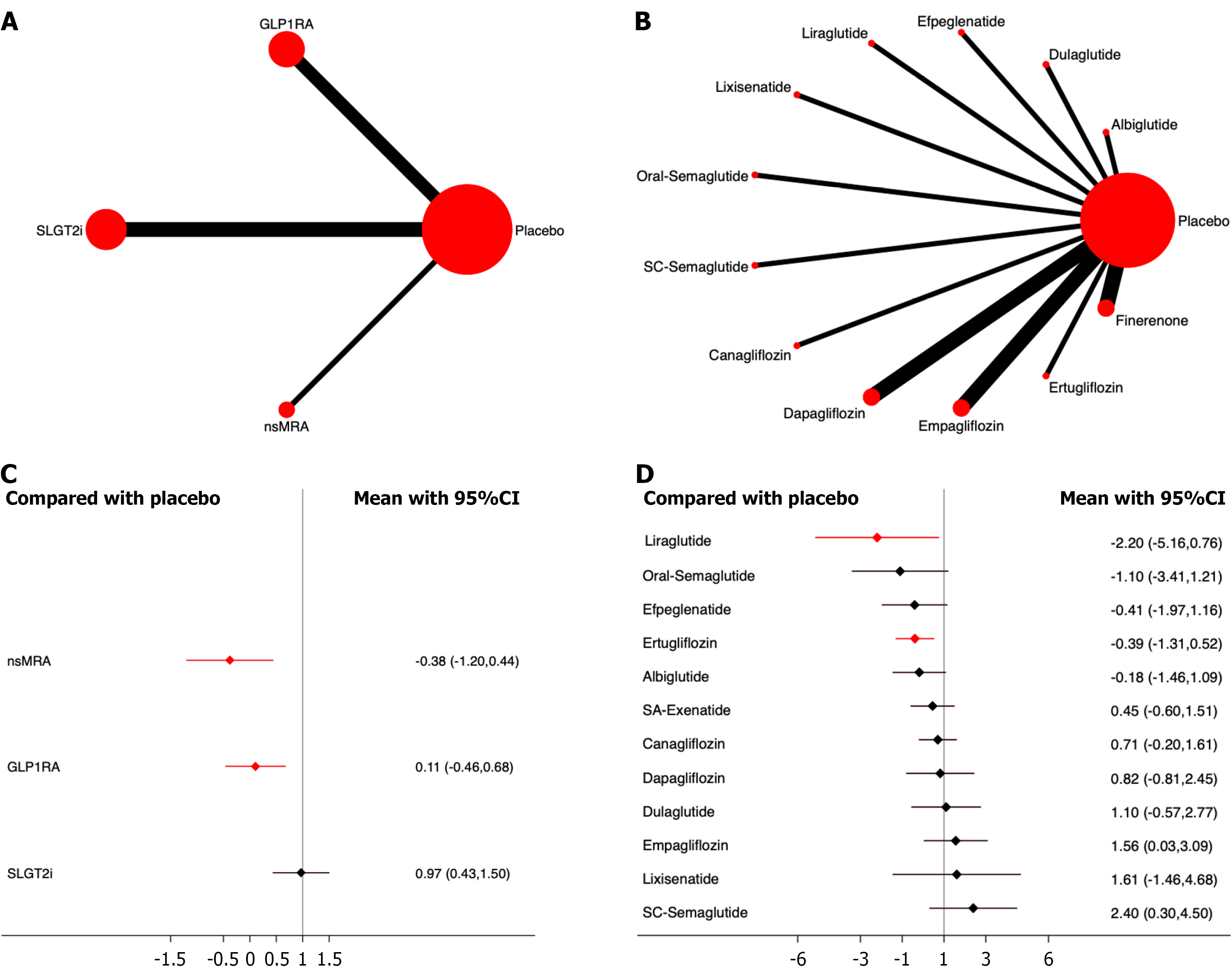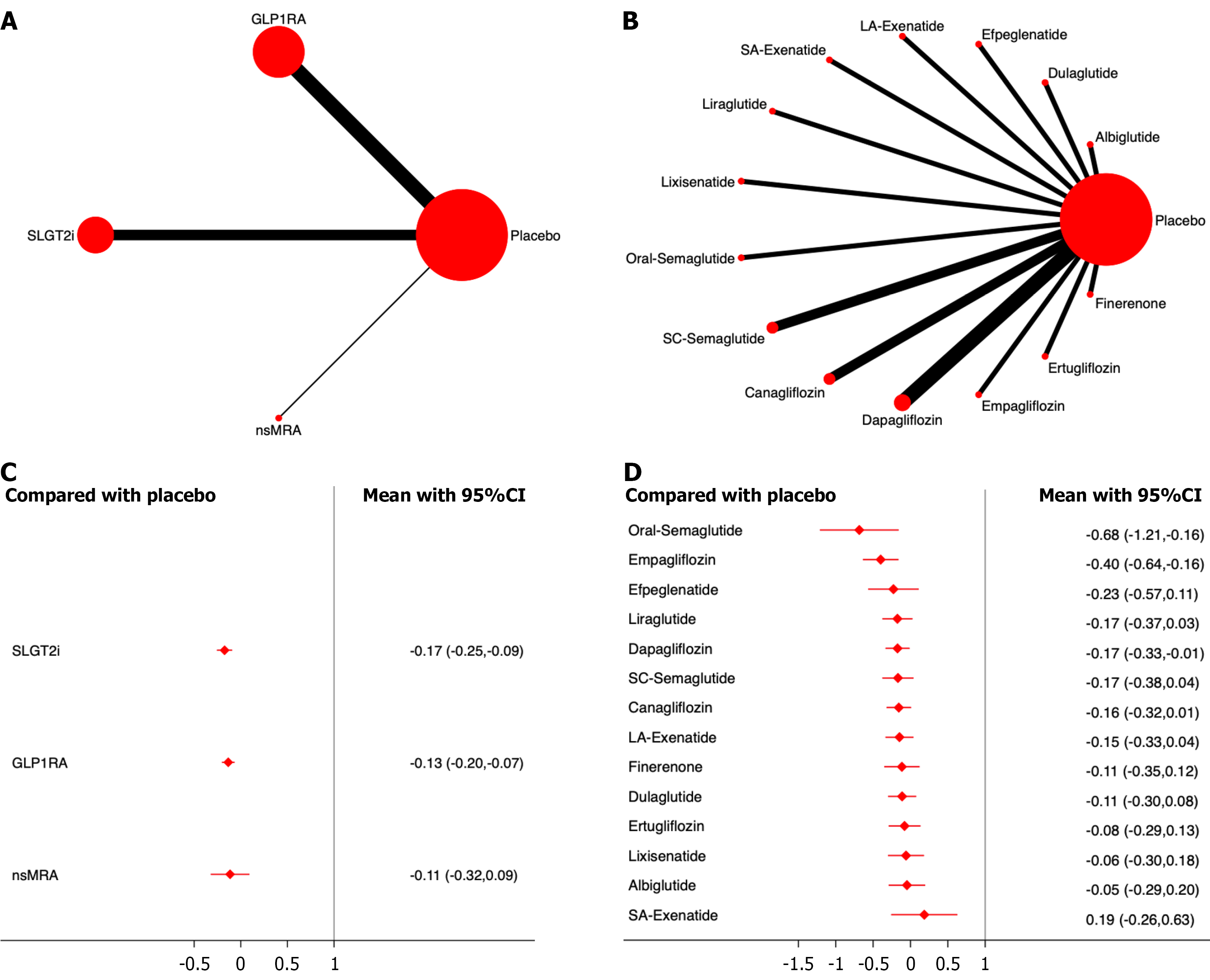 A: Comparison network results for composite renal events of three classes of drugs; B: Comparison network results for composite renal events of different drugs; C: Forest plot for composite renal events of three classes of drugs; D: Forest plot for composite renal events of different drugs.