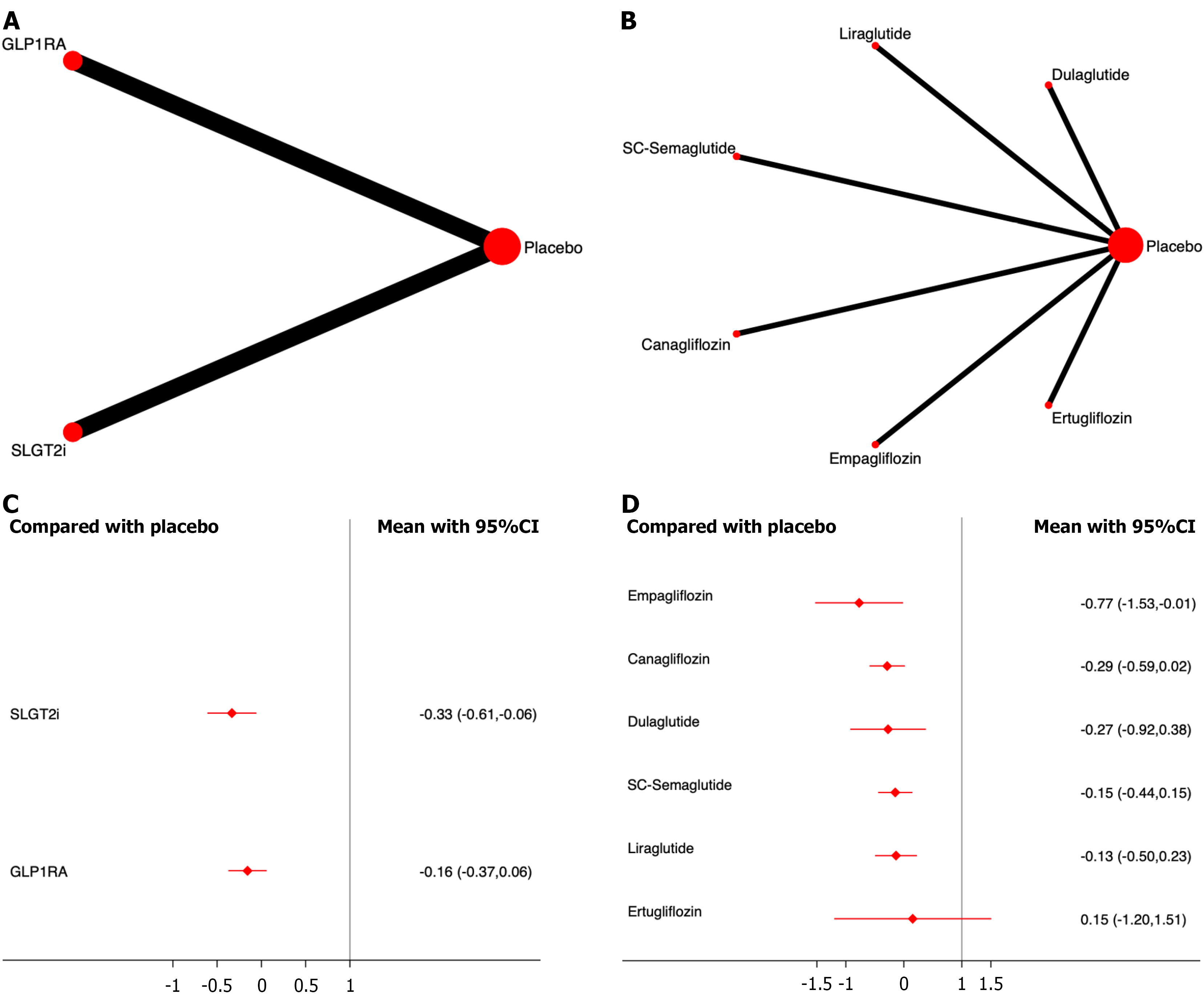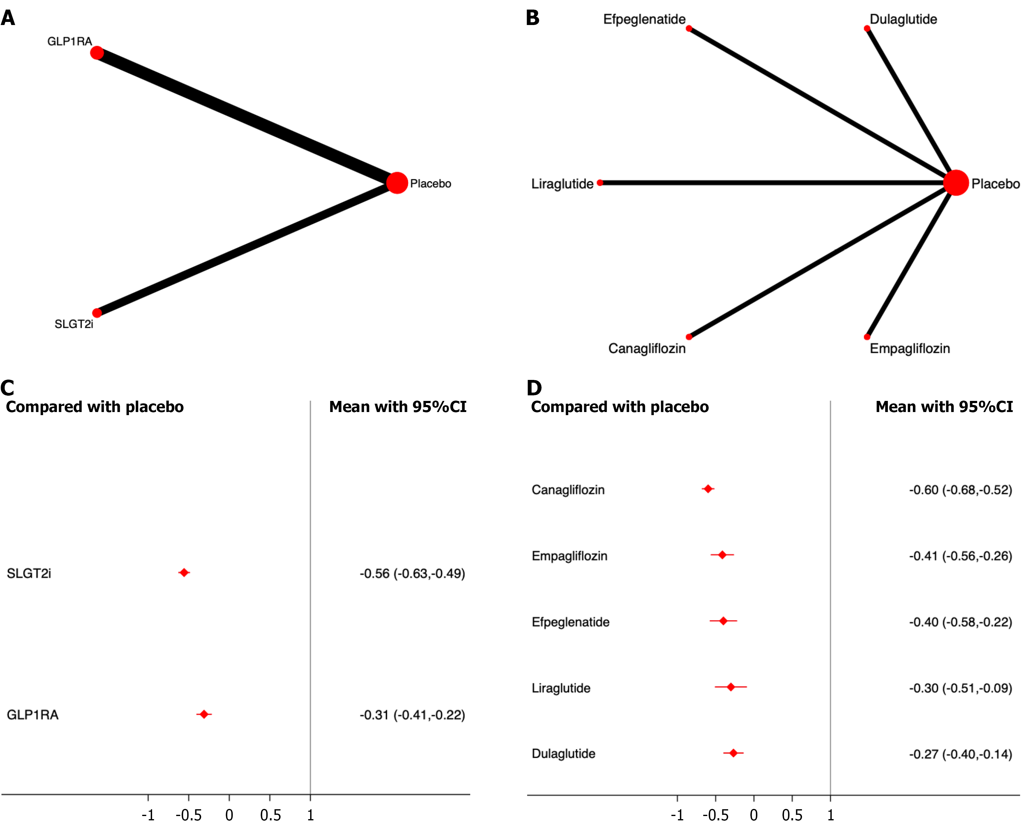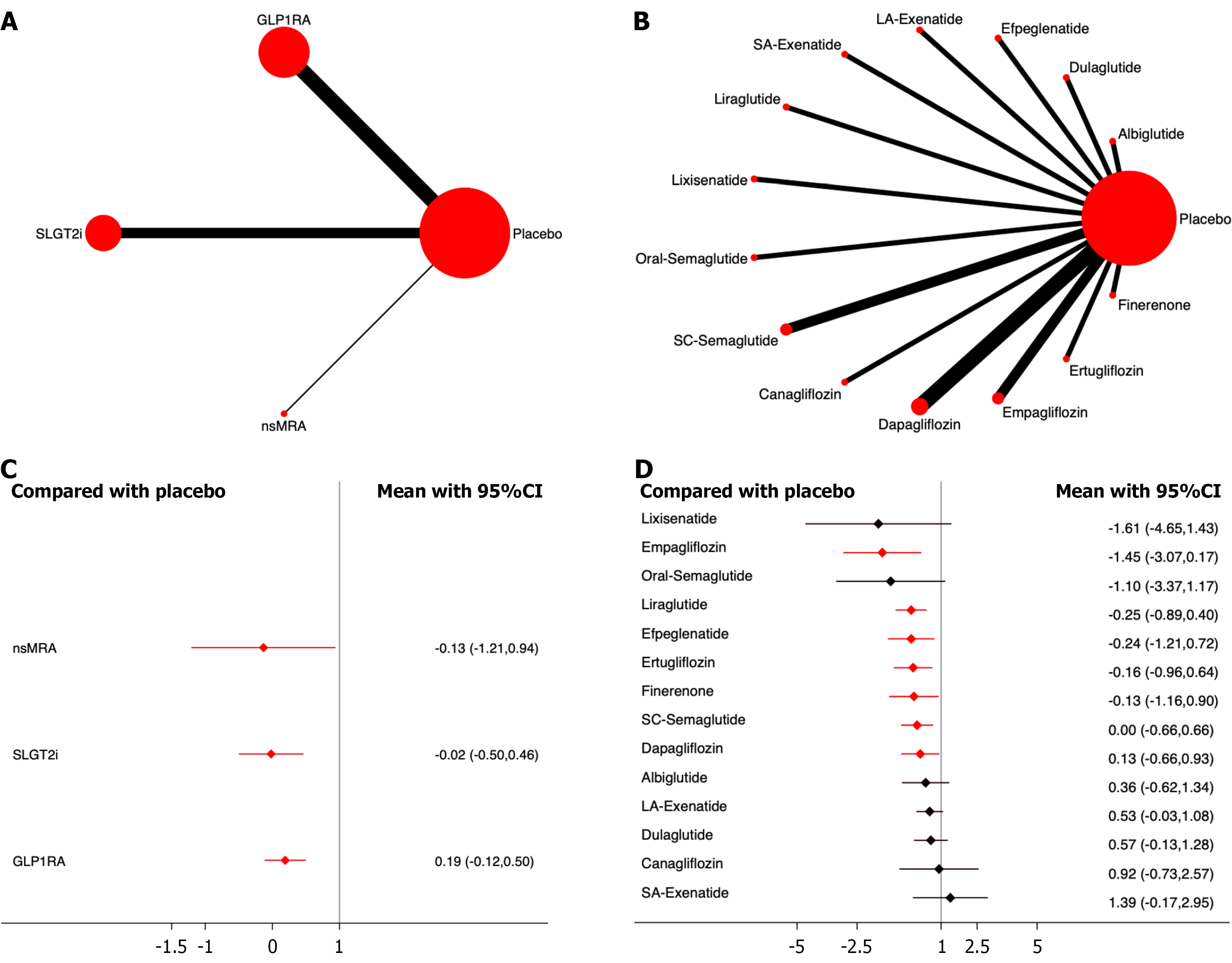 A: Comparison network results for cardiovascular mortality of three classes of drugs; B: Comparison network results for cardiovascular mortality of different drugs; C: Forest plot for cardiovascular mortality of three classes of drugs; D: Forest plot for cardiovascular mortality of different drugs.