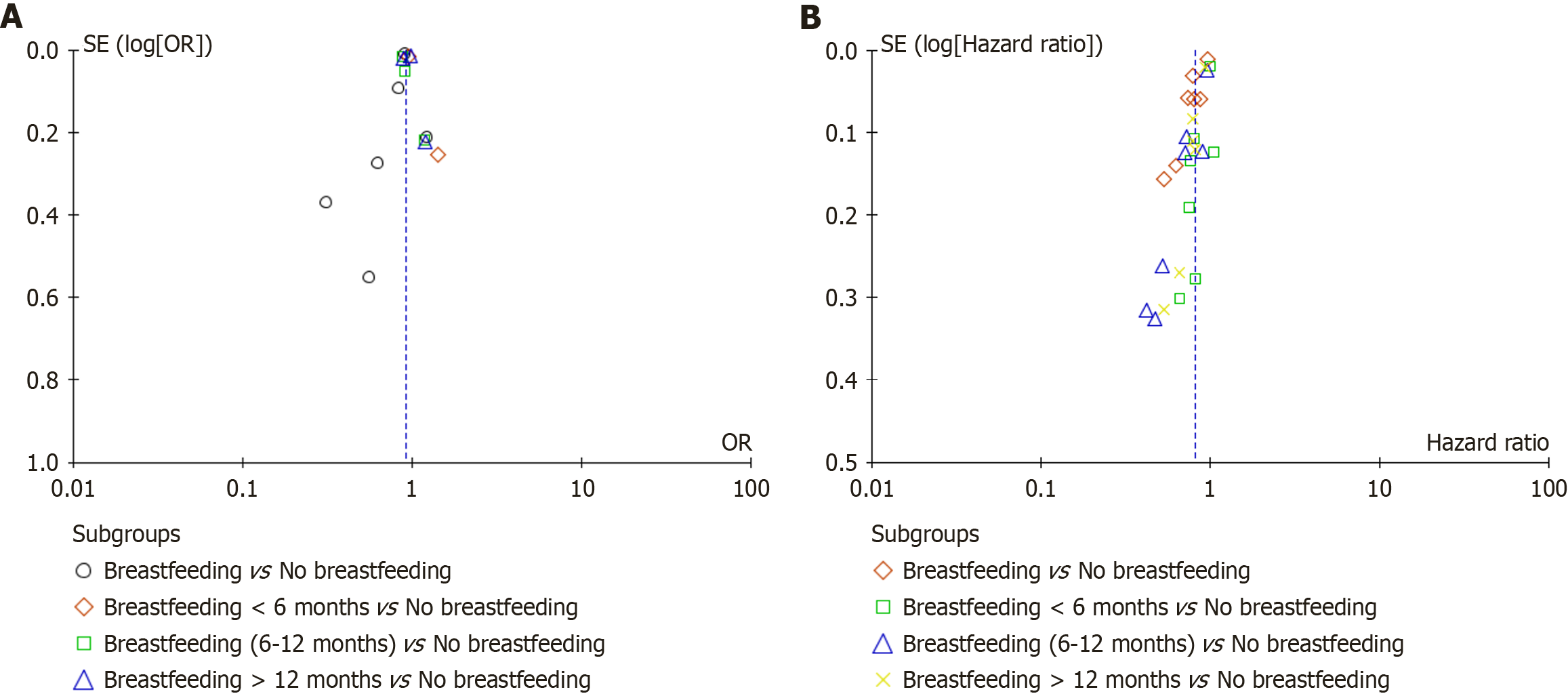 A: Funnel plot to analyze the odds ratios for hypertension risk among parous women; B: Funnel plot for the analysis of risk for diabetes hazard ratio among parous women. SE: Standard error; OR: Odds ratios.