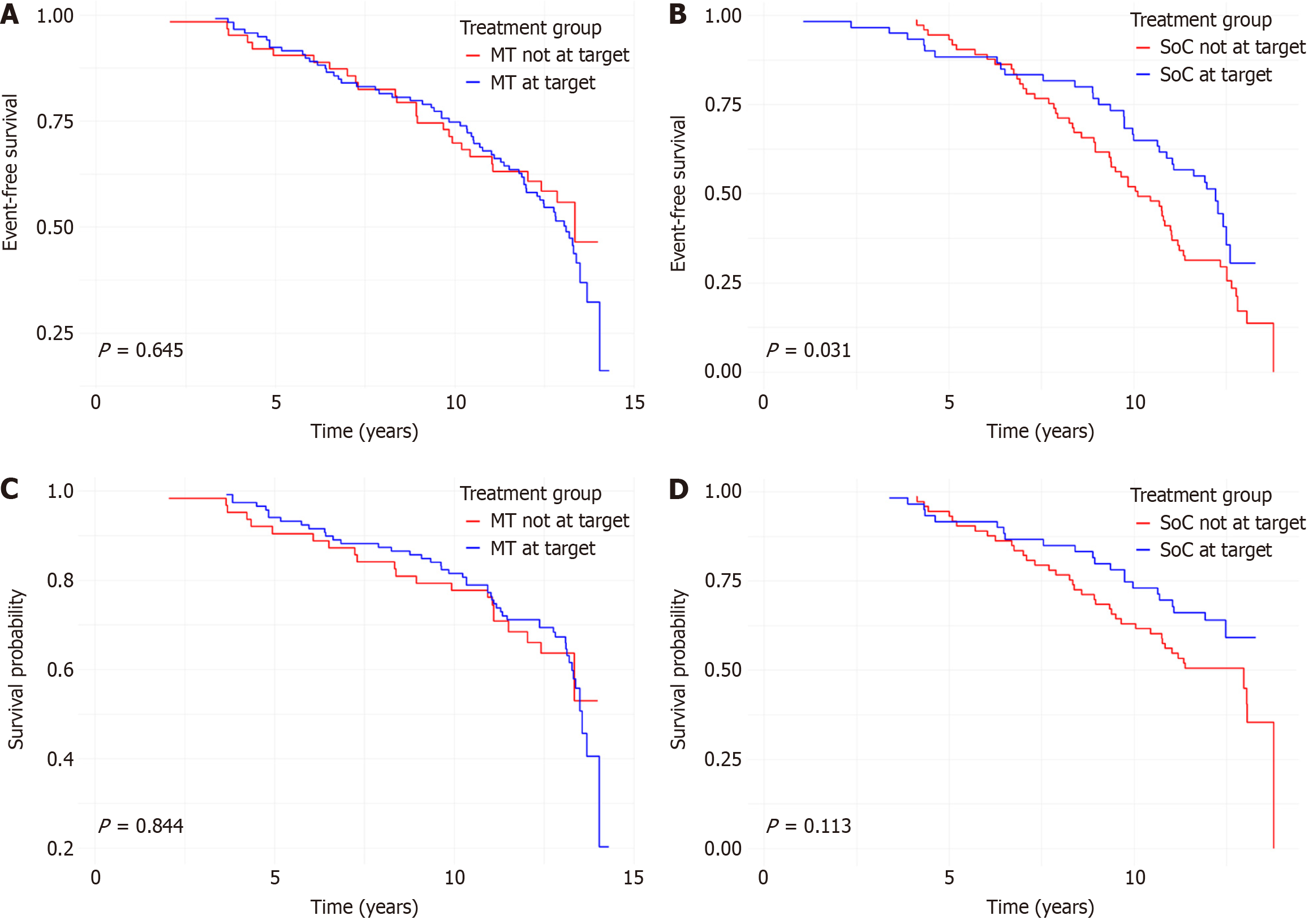 Curves for major adverse cardiovascular events: A: In the multifactorial intensive therapy (MT) group [glycated hemoglobin (HbA1c) at target: Yes = 119; No = 65]; B: In the standard of care (SoC) group (HbA1c at target: Yes = 60; No = 79); Curves for all-cause mortality: C: In the MT group (HbA1c at target: Yes = 119; No = 65); D: In the SoC group (HbA1c at target: Yes = 60; No = 79). In each panel, red curves indicate patients not at HbA1c target, and blue curves indicate patients at HbA1c target within the corresponding therapy group. MT: Multifactorial intensive therapy; SoC: Standard of care.