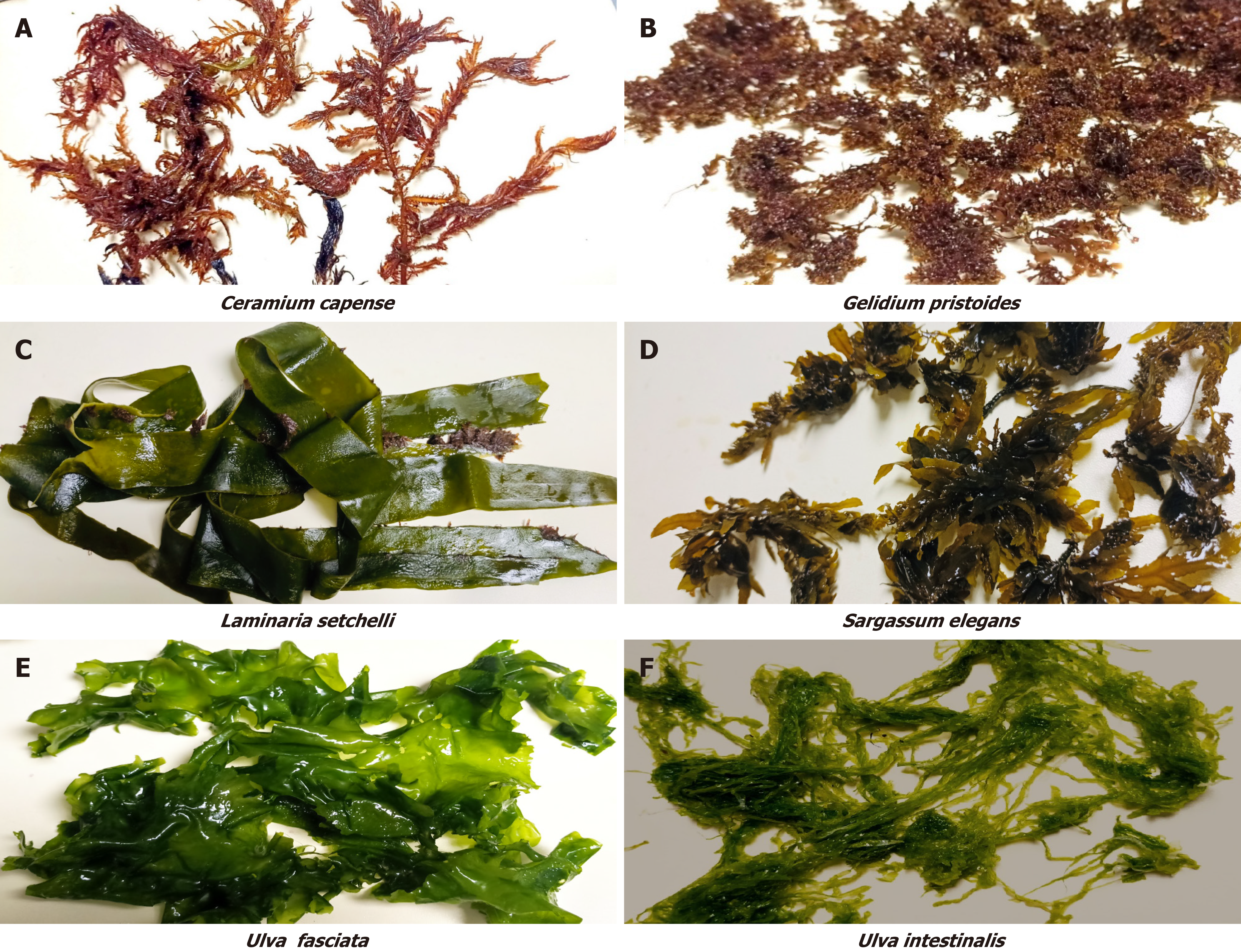 A and B: Rhodophyta [Ceramium capense (Voucher number: NU0092414) and Gelidium pristoides (Voucher number: NU0092402)]; C and D: Phaeophyceae [Laminaria setchelli (voucher number: NU0092411) and Sargassum elegans (voucher number: NU0092416)]; E and F: Chlorophyta [Ulva fasciata (voucher number: NU0092397) and Ulva intestinalis (voucher number: NU0092420)]. The seaweeds were identified at Bews Herbarium, University of KwaZulu-Natal, Pietermaritzburg, South Africa.