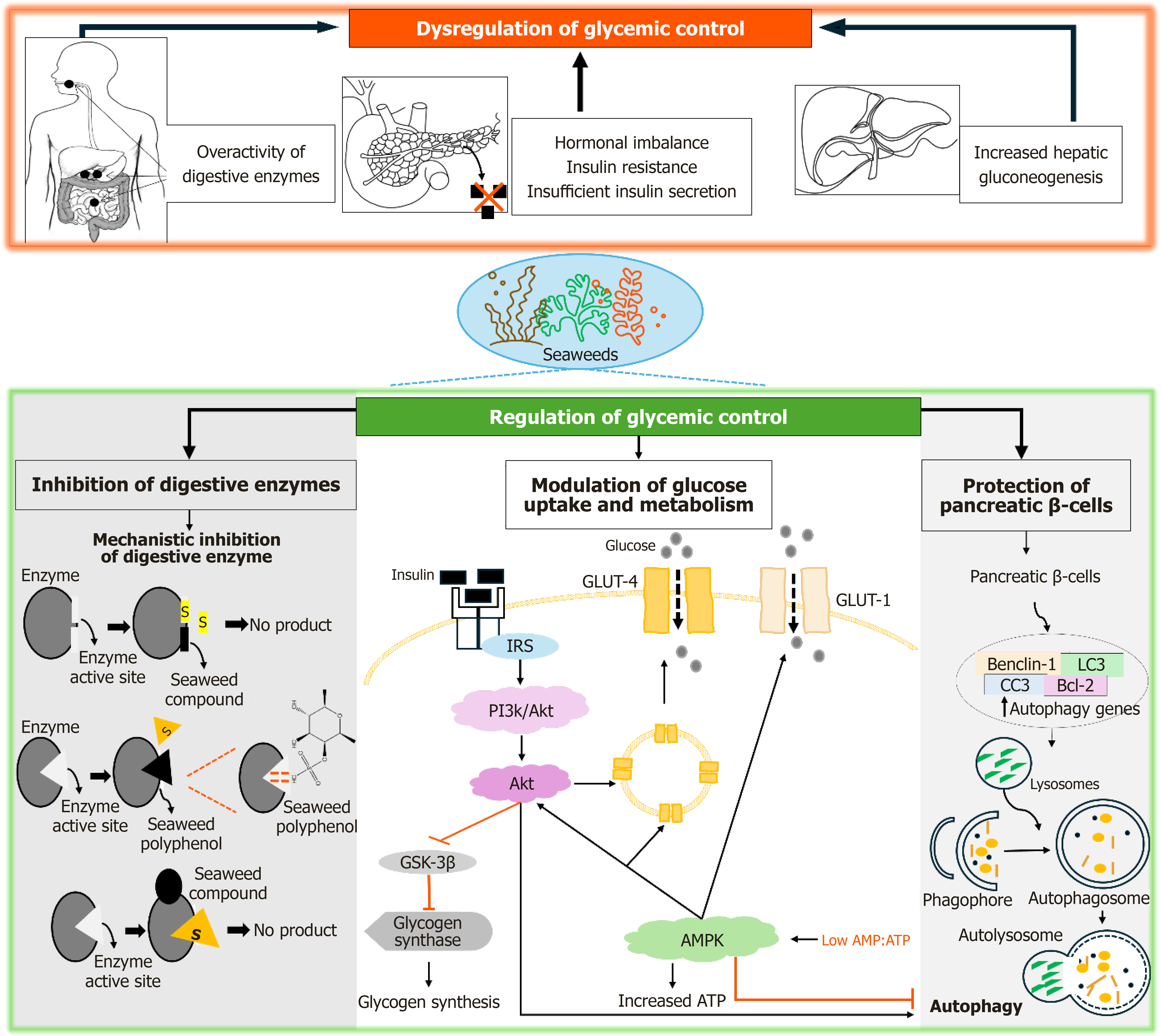 Figure 3 The dysregulation of glycemic control and the antidiabetic effects of seaweeds and their compounds, involving molecular mechanisms of glycemic control regulation through inhibition of digestive enzymes, modulation of glucose uptake, insulin sensitivity and secretion, and protection of pancreatic beta cells.