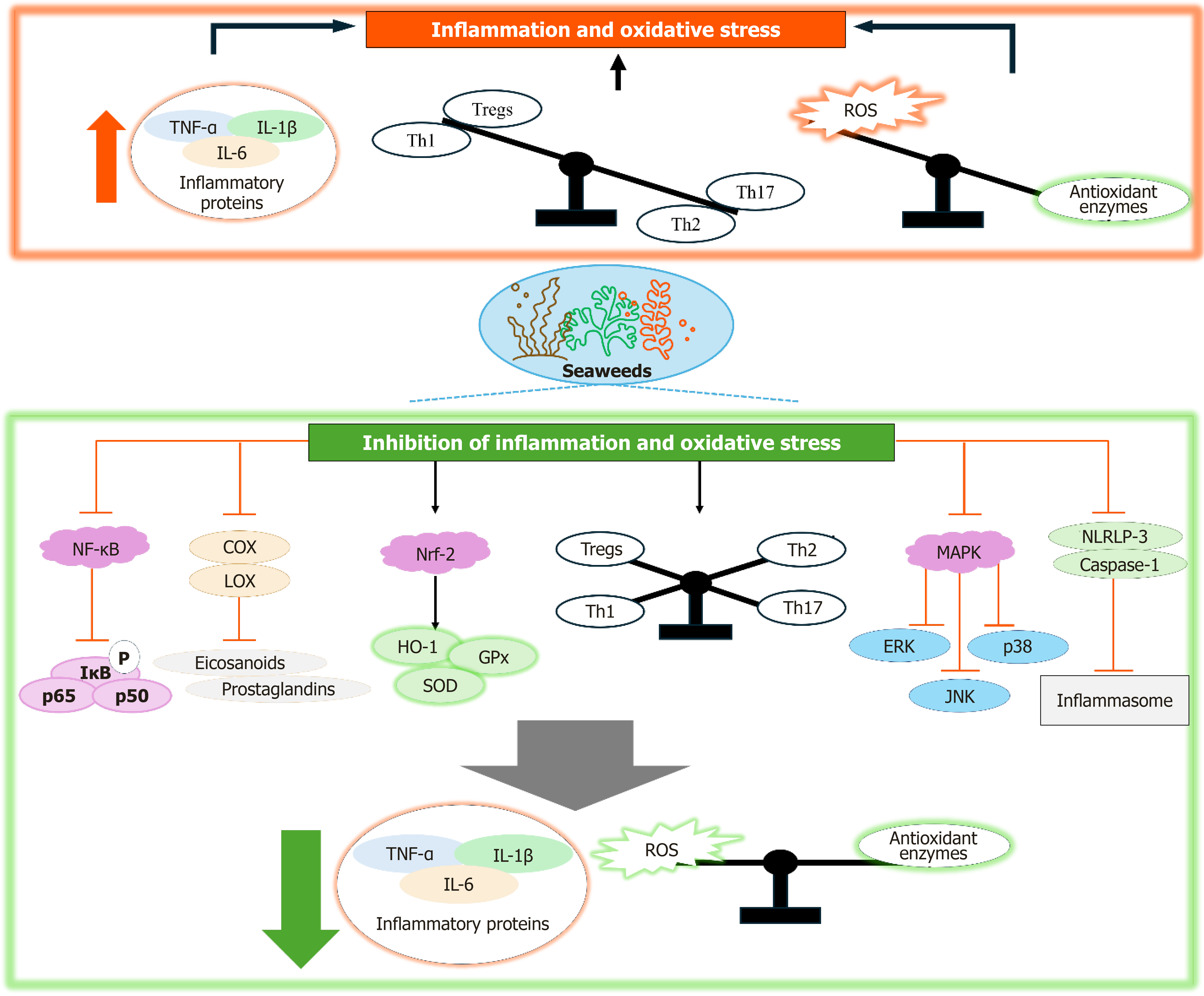 Figure 4 Inflammation and oxidative stress in diabetes and the inhibition of these processes by seaweeds and their compounds, involving mechanisms of action that modulate inflammatory pathways such as inhibition of nuclear factor kappa-B, cyclooxygenase, lipoxygenase, MAPK, NRLP-3, and caspase-1, and enhance antioxidant defense systems including nuclear factor erythroid 2-related factor 2 pathway.