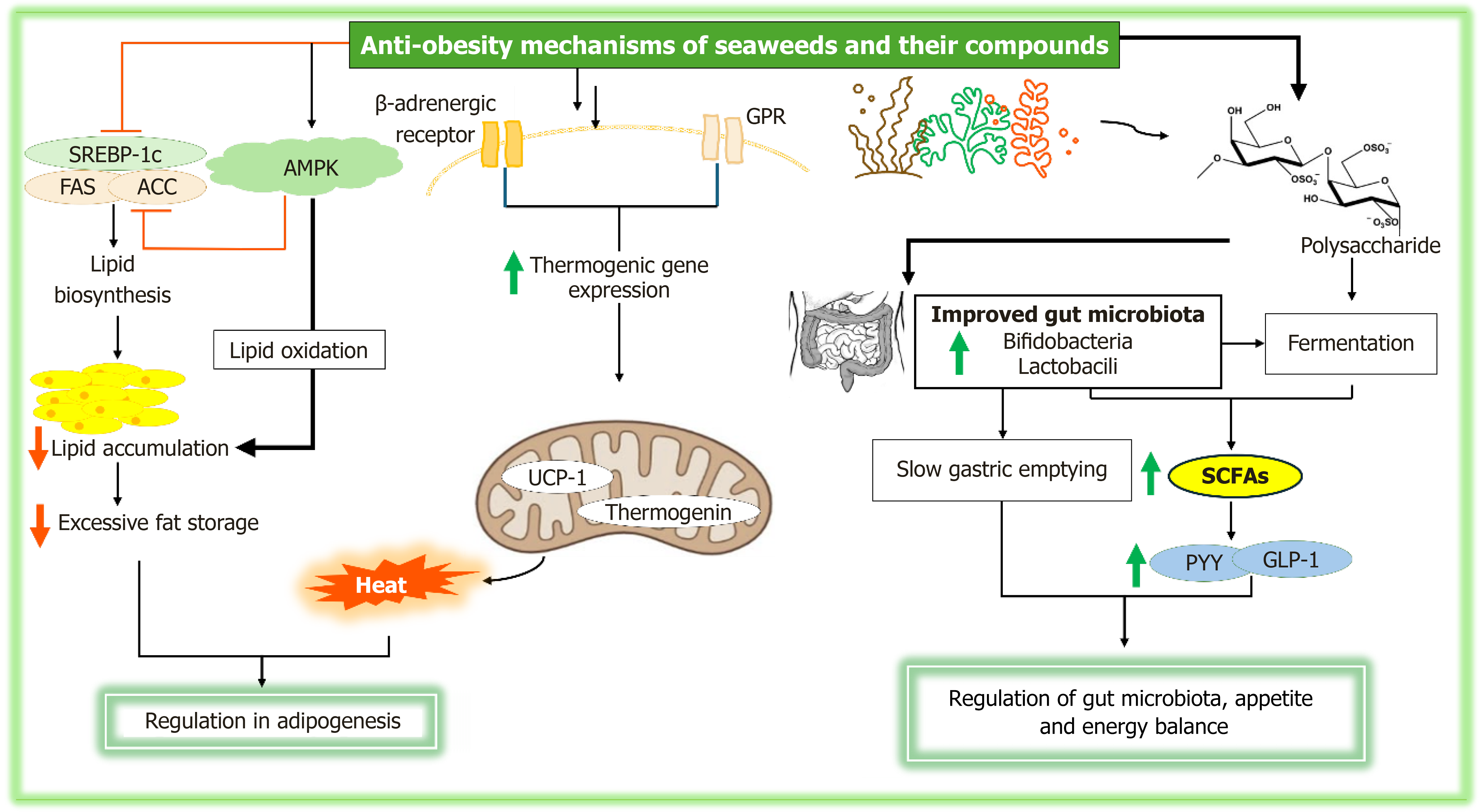 AMPK: Adenosine monophosphate-activated protein kinase; SREBP: Sterol regulatory element-binding protein 1c; FAS: Fatty acid synthase; ACC: Acetyl-CoA carboxylase; UCP-1: Uncoupling protein-1; SCFAs: Short-chain fatty acids; PYY: Peptide YY; GLP: Glucagon-like peptide-1.