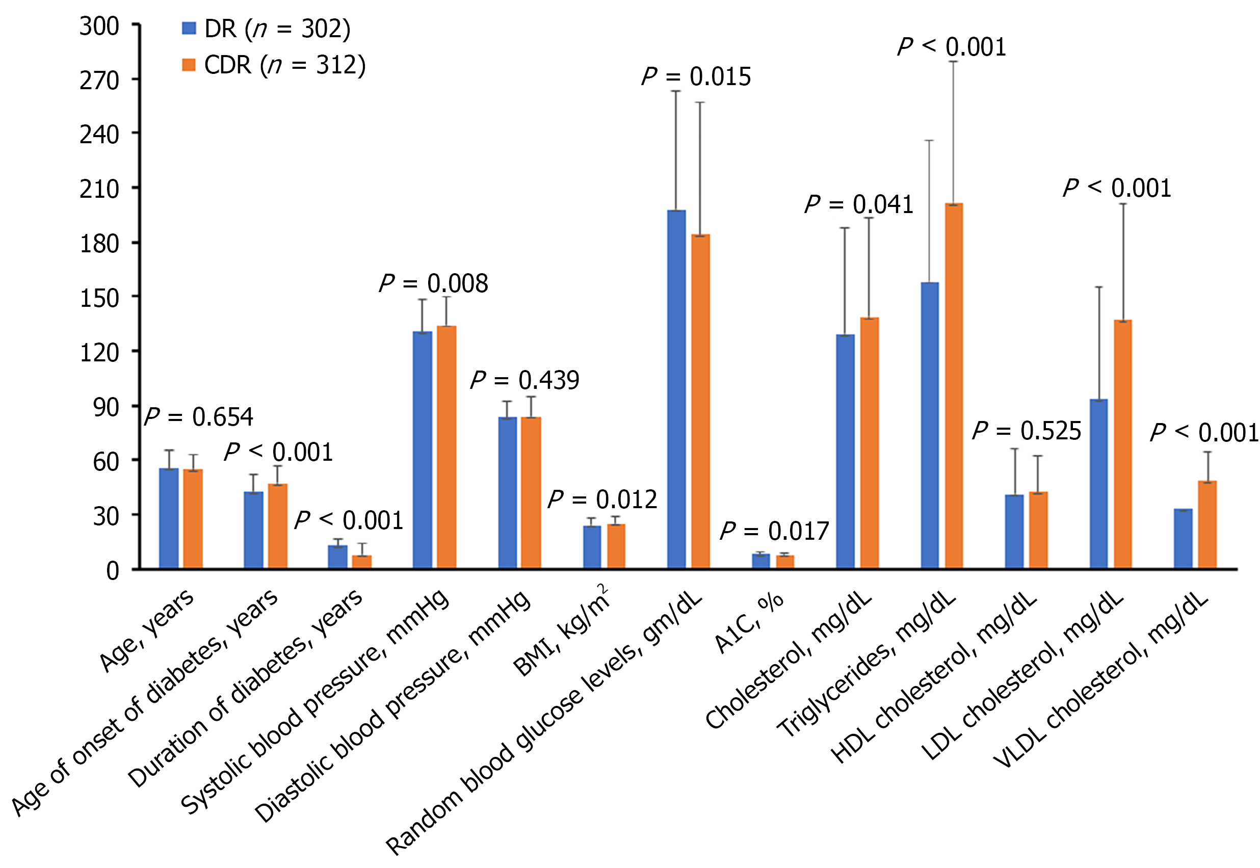 BMI: Body mass index; A1C: Acetylated hemoglobin; HDL: High-density lipoprotein; LDL: Low-density lipoprotein; VLDL: Very low-density lipoprotein; DR: Diabetic retinopathy; CDR: Controls without diabetic retinopathy.