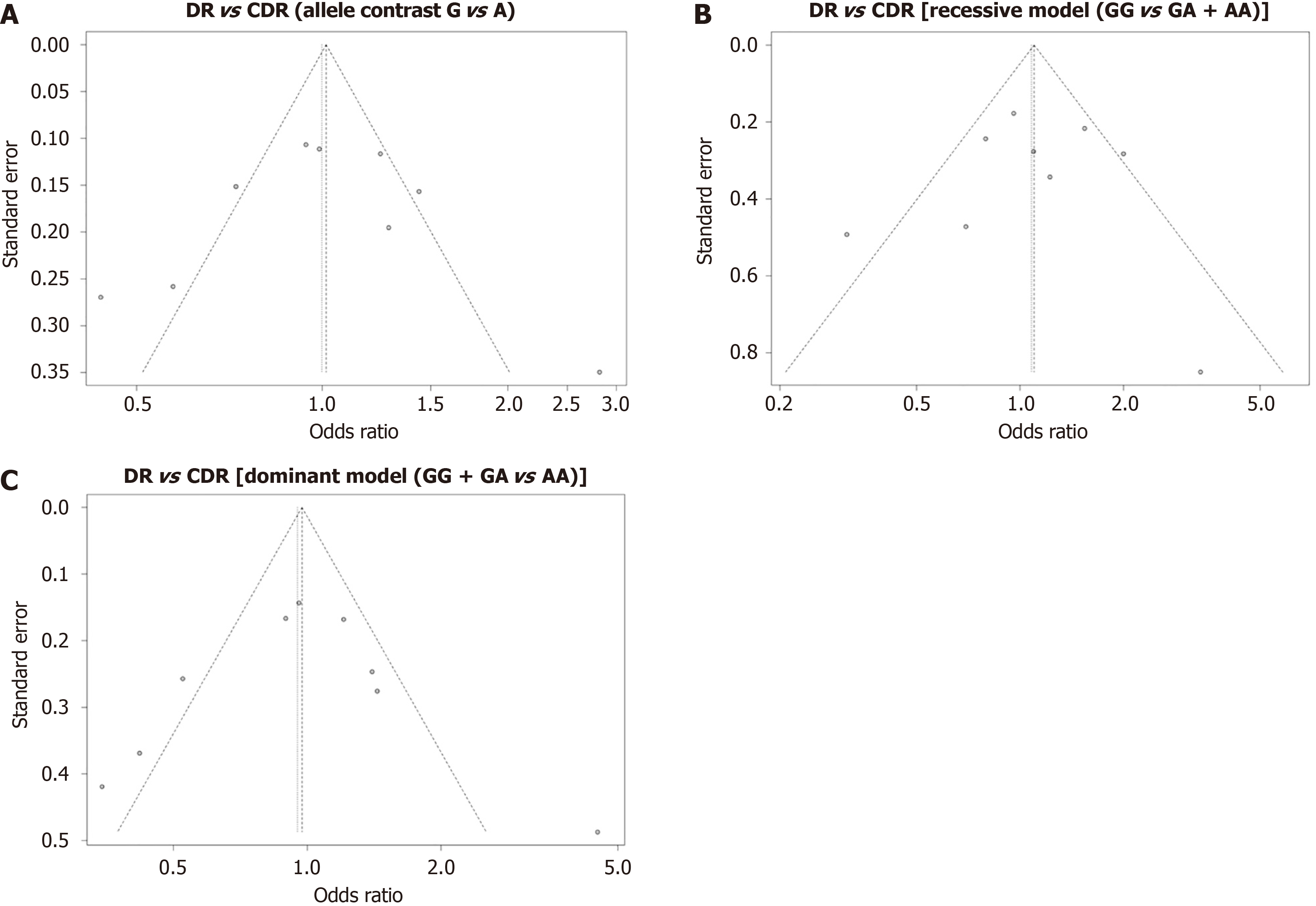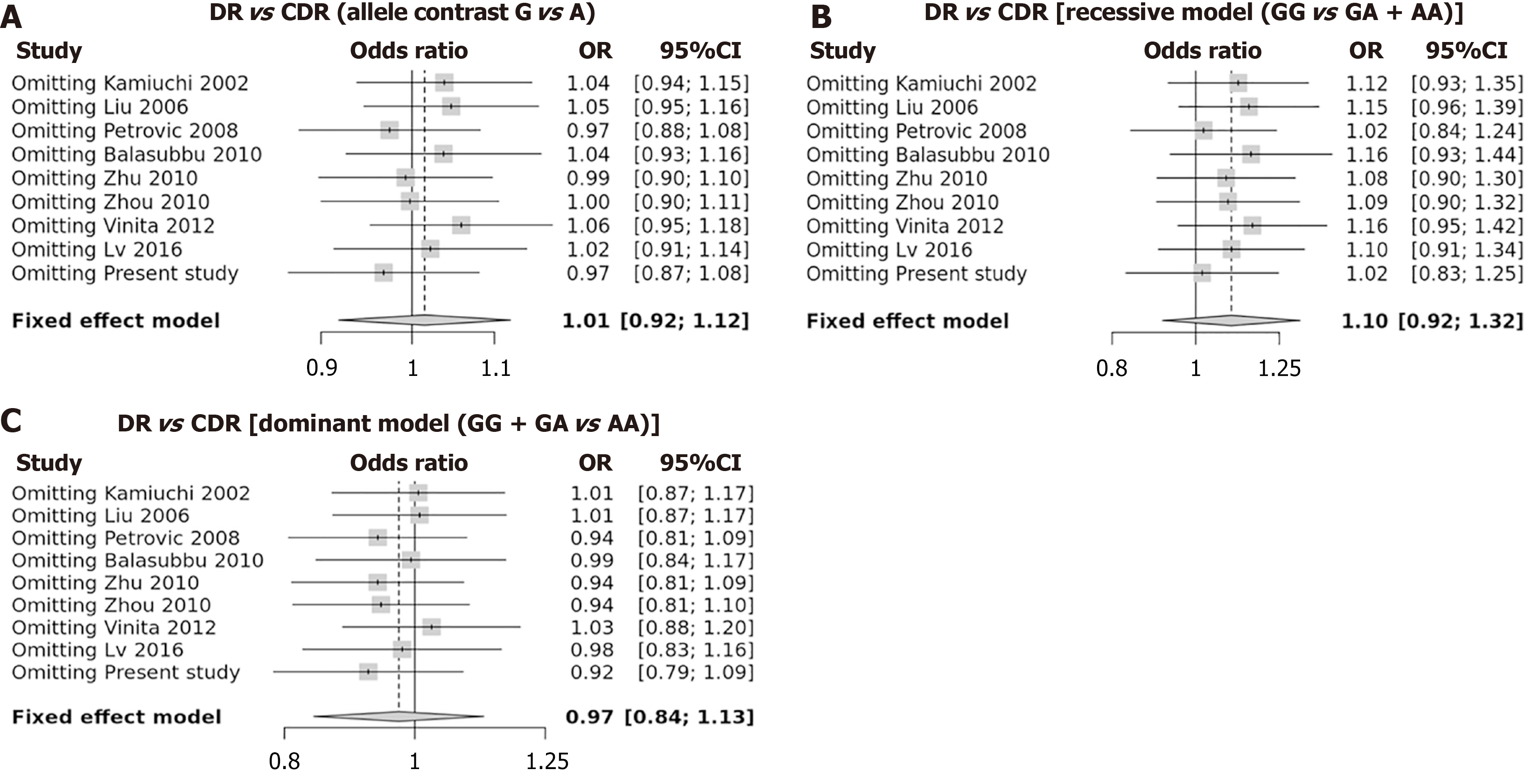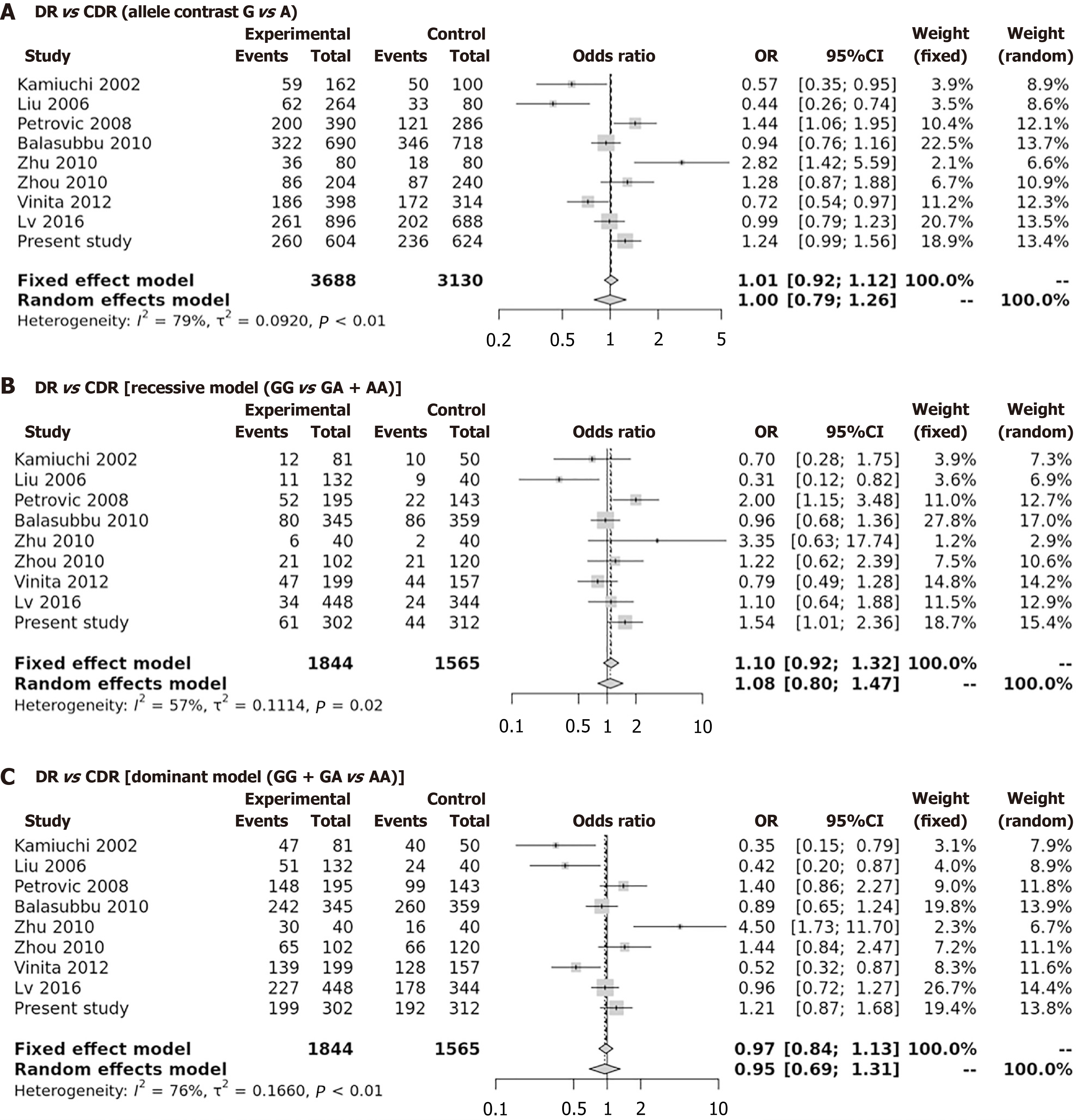 1405A>G (rs5498) polymorphism and type 2 diabetic retinopathy. A: Allelic model (G vs A); B: Recessive model (GG vs GA + AA); C: Dominant model (GG + GA vs AA). DR: Diabetic retinopathy; CDR: Controls without diabetic retinopathy.
