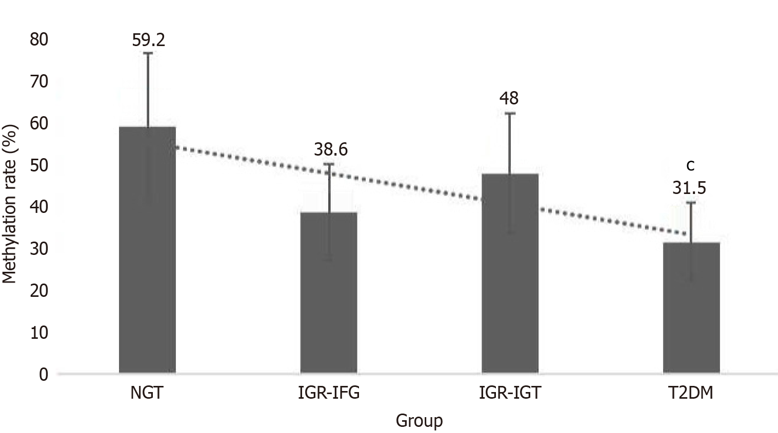 Methylation levels in type 2 diabetes mellitus were 315% lower than normal glucose tolerance (NGT) (59.2%, P < 0.001) and lower than impaired glucose tolerance (IGT) (48%, P < 0.001). Error bars: 95%CI. Data derived from methylation-specific PCR analysis of peripheral leukocytes (n = 392). cP < 0.001: Compared to NGT and IGT. IGT: Impaired glucose tolerance; IGR: Impaired glucose regulation; NGT: Normal glucose tolerance; T2DM: Type 2 diabetes mellitus.