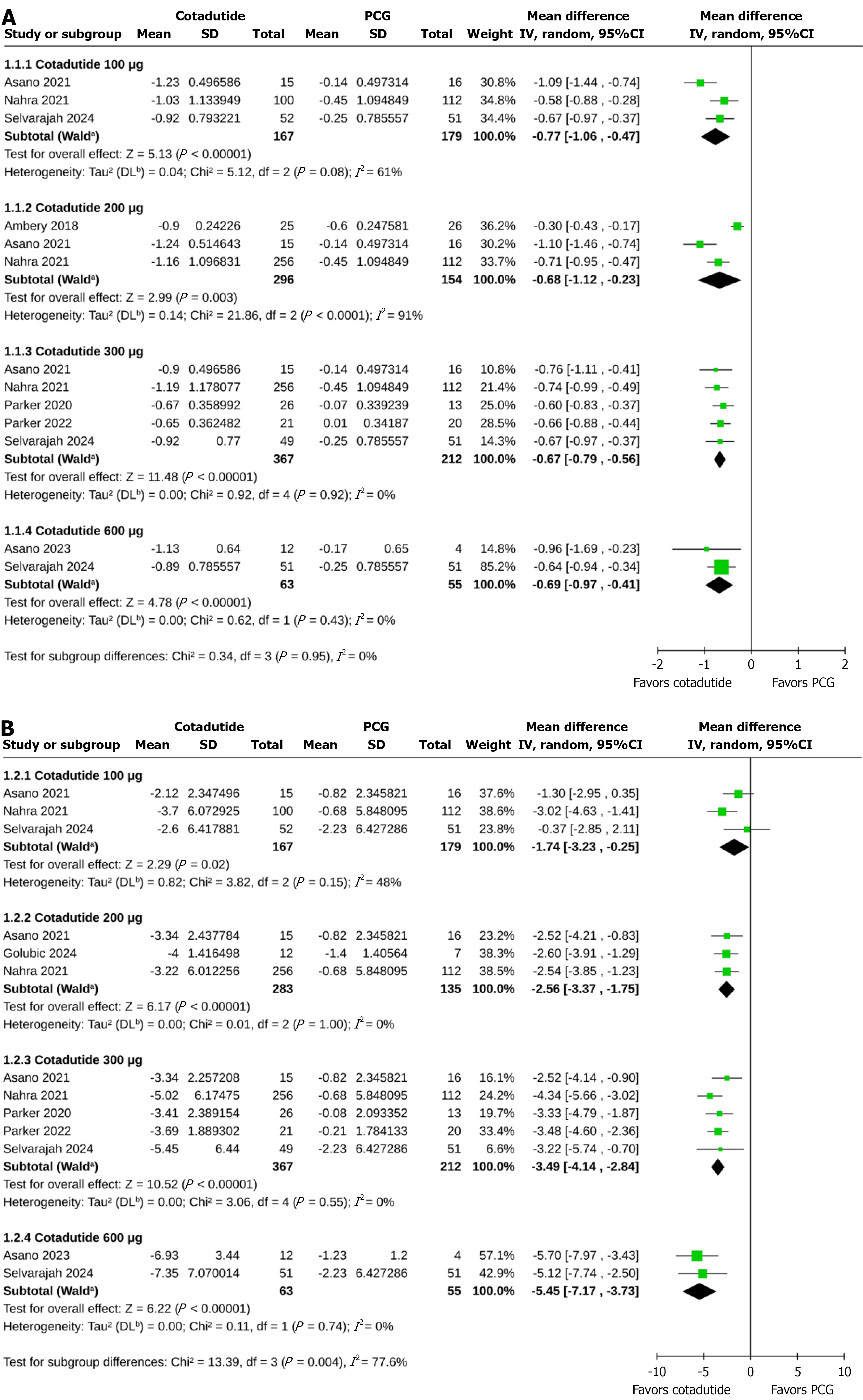 A: Highlighting the impact of cotadutide as compared to the placebo control group on changes in glycated hemoglobin from baseline; B: Highlighting the impact of cotadutide as compared to the placebo control group on percent changes in body weight from baseline. PCG: Placebo control group; CI: Confidence interval. aCI calculated by Wald-type method, bTau2 calculated by DerSimonian and Laird method.